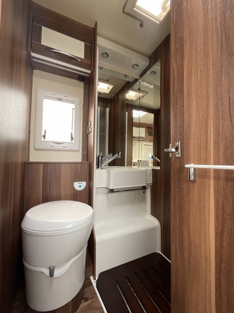 Moving forward is the well appointed and roomy washroom with a swivel Thetford cassette toilet, vanity washbasin, two wall mirror, shower with frosted screen divide, medicine cabinet storage, dark wood duck board and opening opaque side window.