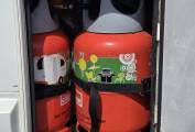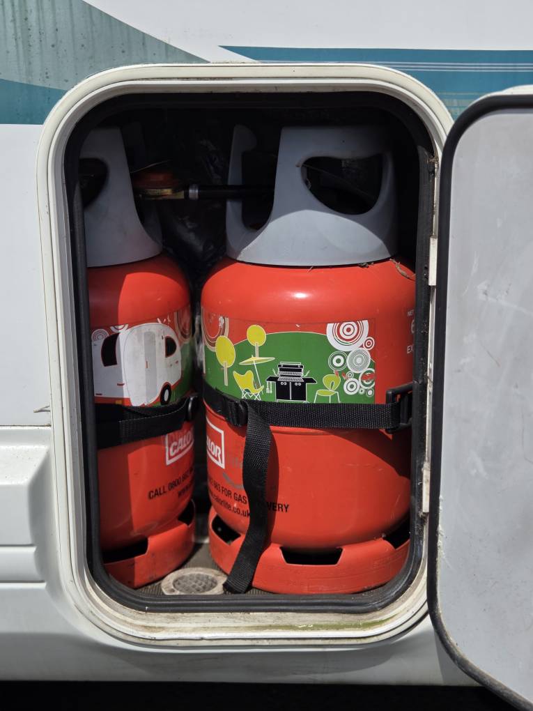 Outside you have a rear full height ladder to access the roof, the mains hook-up point and the gas locker which contains 2 x large gas bottles.