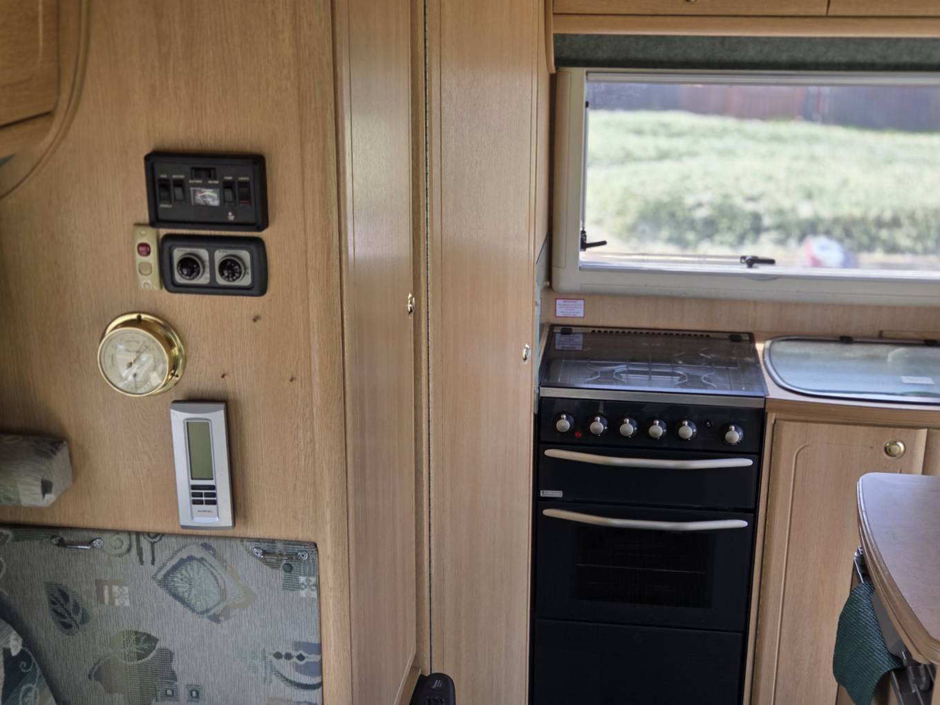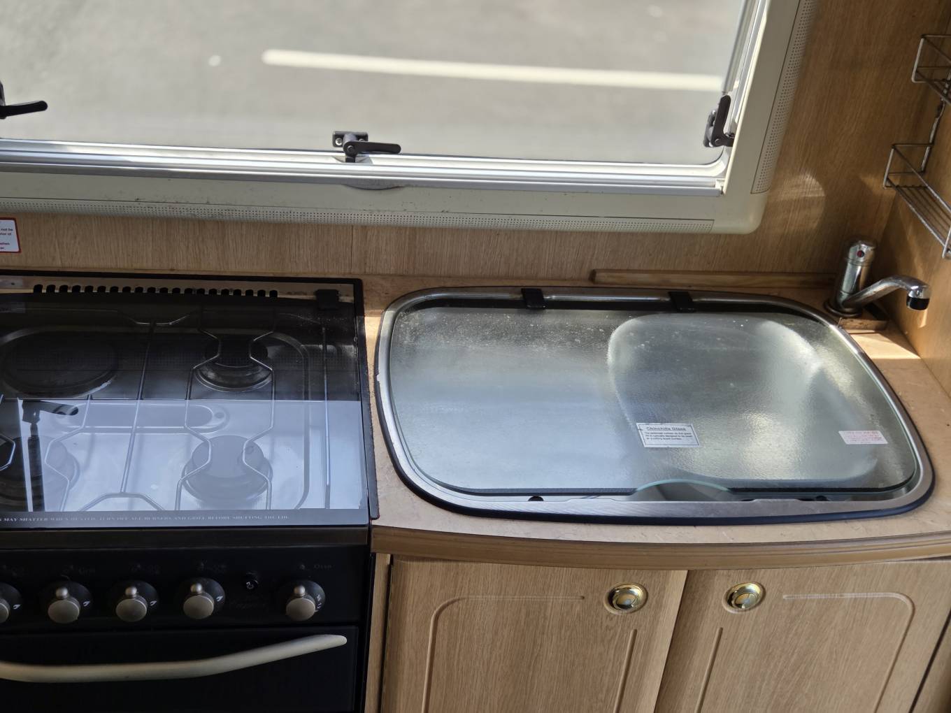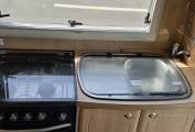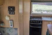 Step inside from the near side rear and the kitchen is on your right, with a large stainless steel sink & drainer with a protective lid to cover and chrome mixer tap. Adjacent to that is a black enamel hob, with 4 gas burners, a gas grill and full size oven beneath.
