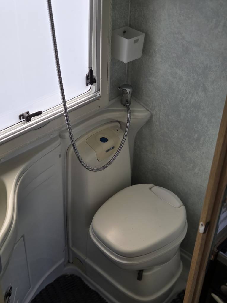 Behind the lounge, the washroom has a large shower and tray, a built-in washbasin with mixer tap, cupboard beneath and mirror above, a separate shower tap and shower head, plus a Thetford cassette swivelling toilet with electric flush.