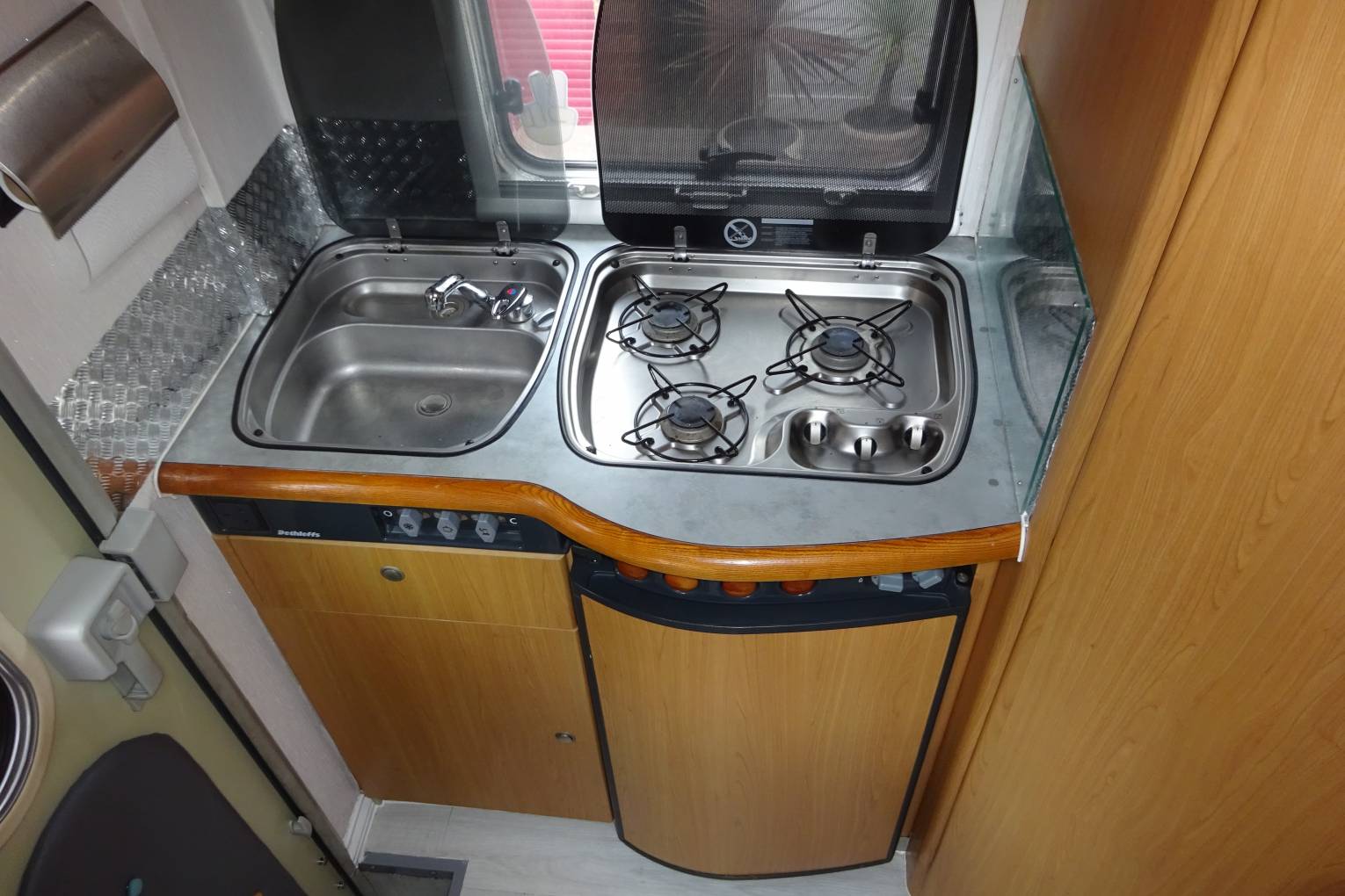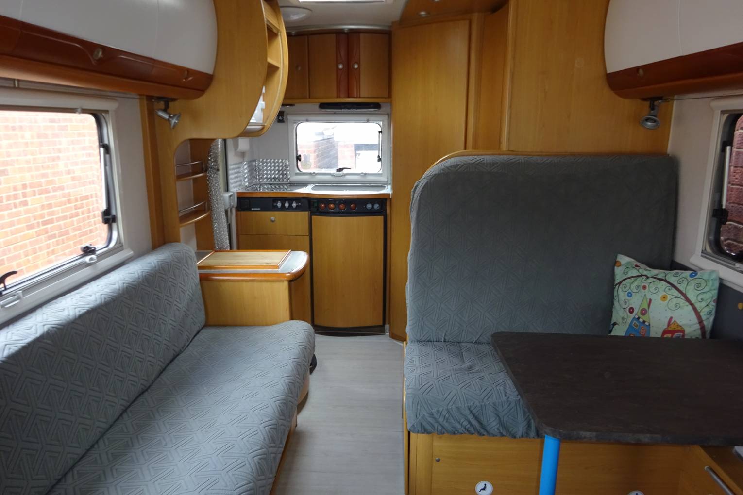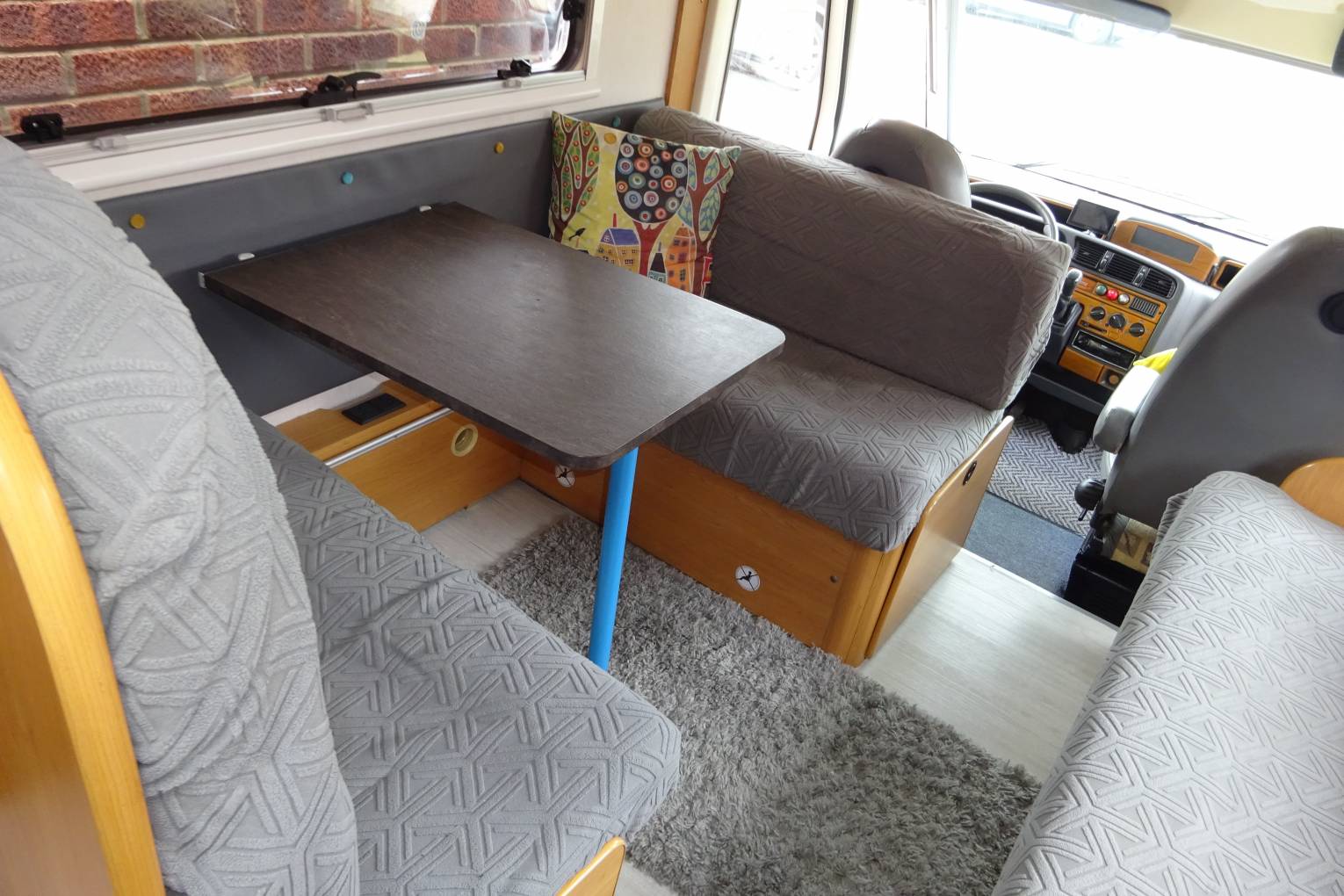 As you step inside the motorhome you get a real feel for the condition of the Motorhome with a light, warm, comfortable feel. The dinette has seating for 6 with a fixed table. The kitchen is fitted with a 3 burner gas hob, induction hob, sink, microwave, and large fridge with icebox that allows for all your cooking needs. The washroom is adjacent to the kitchen with a sink toilet and shower. There is a large double pull down bed above the cab area, with the dinette making in to another double with the long settee making a 5th bunk. There is ample storage throughout the living area, kitchen and bathroom for all your needs including a wardrobe and storage under the benches. The motorhome is also fitted with habitation air-con.