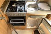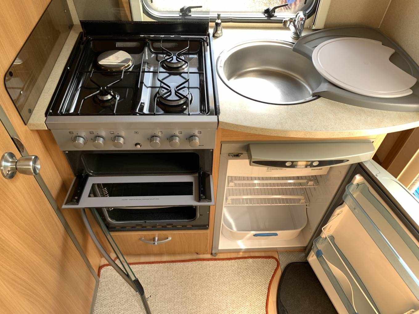 The kitchen is equipped with a 3 burner gas hob, electric hot plate, stainless sink, oven/grill, a 3 way Dometic fridge freezer and 240v microwave.