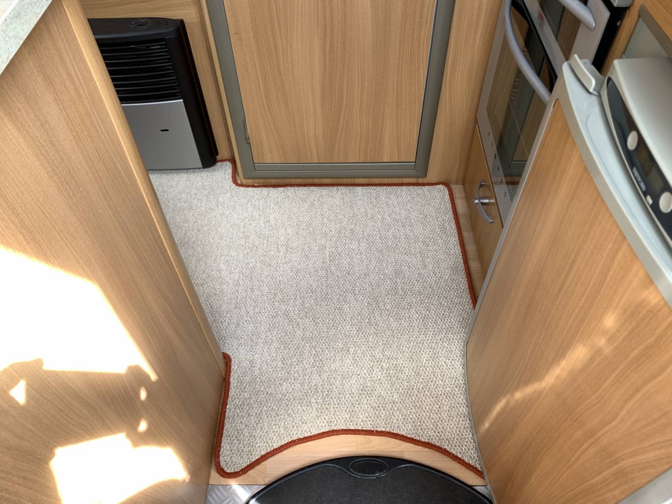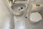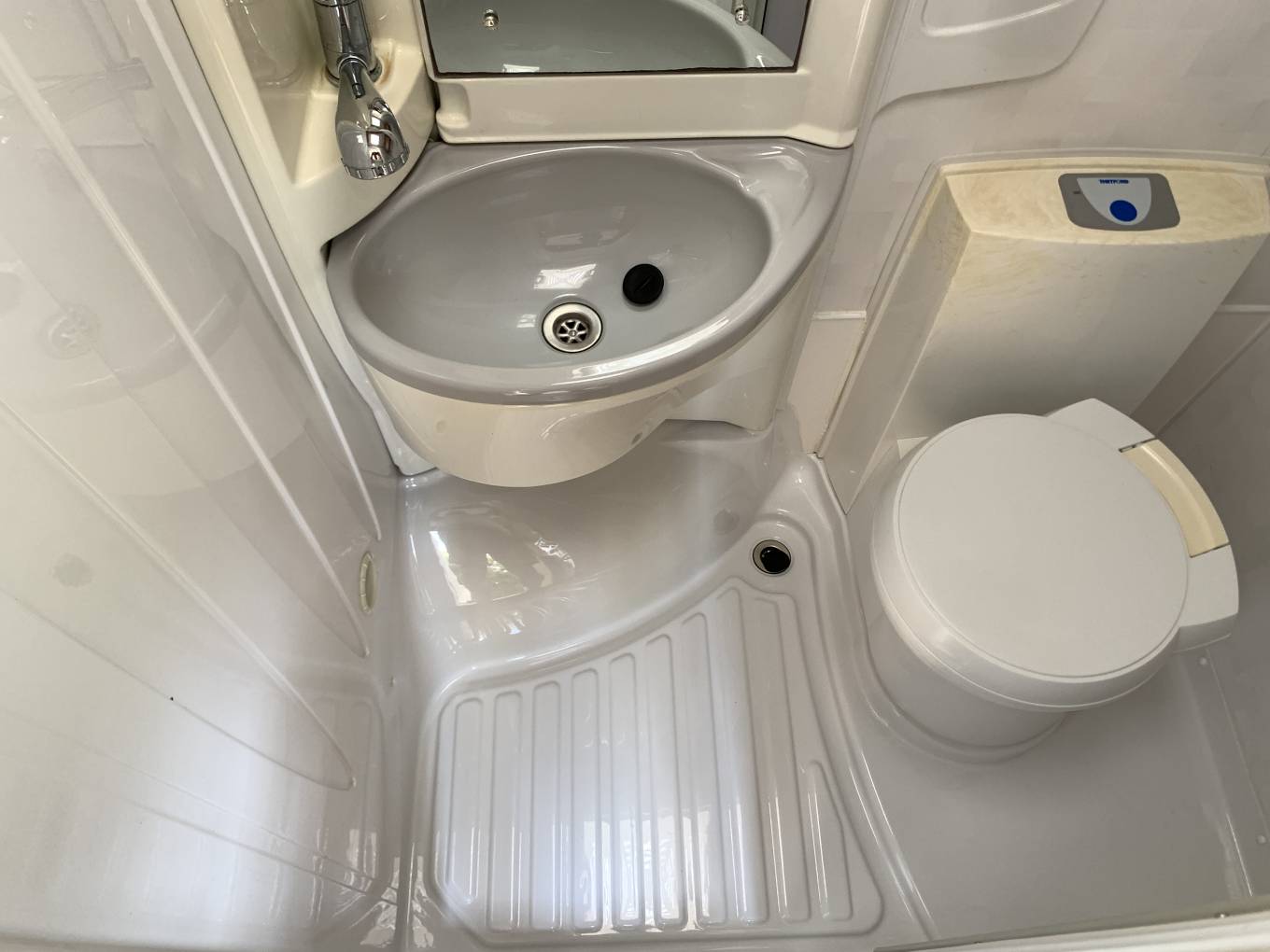 The washroom has a Thetford electric flush toilet, corner wash basin and seperate shower area by way of swinging the sink wall inwards.