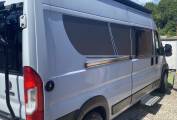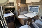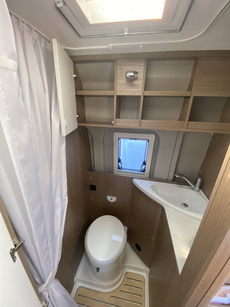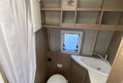 It has a 5 berth and four seatbelts, layout and a comfortable living space and is equipped with features like fixed double bunk beds, a side shower and toilet and a rear storage space. The bunk beds can be taken out and made into two single beds at the back. This vehicle is less than 6m long and is based on the reliable Fiat Ducato 2.3 litre Multijet, Euro 6 engine with a six speed gearbox. It comes with the uprated chassis with a max gross weight of 3500kg and a payload of 649kg, 16inch alloy wheels, air conditioning, cruise control, electric heated mirrors, sat-nav, DAB radio. It's been fitted with a new leisure battery.