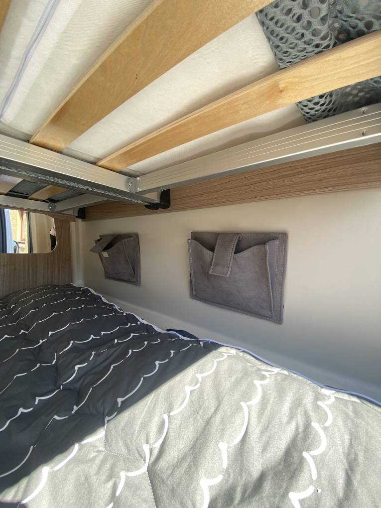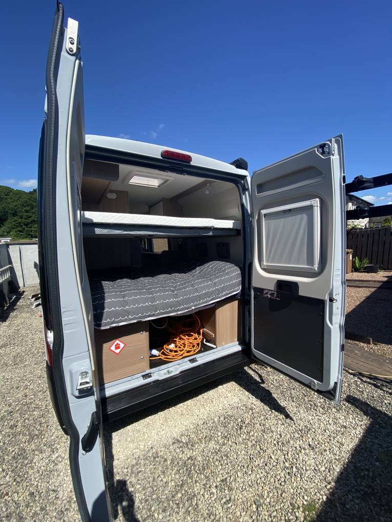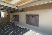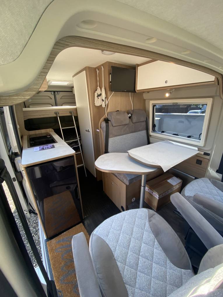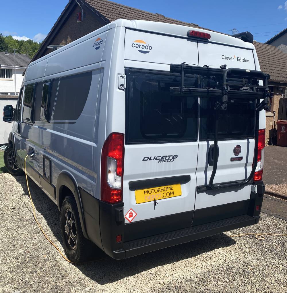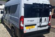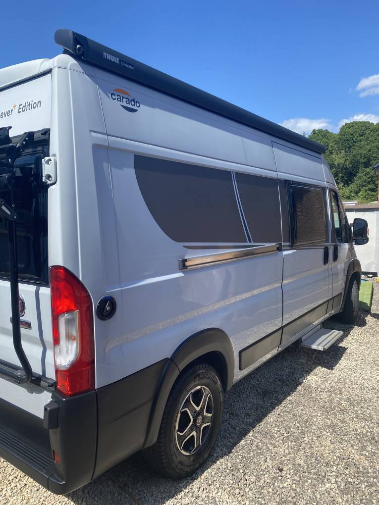 Being manufactured in Germany the Carado is very well finished with comfortable seating and stylish fixtures and fittings. As you step into the habitation area using the sliding side door and the retractable electric entrance step, you will find the lounge / dining area at the front of the van. With both Captains seats swivelled it makes a very comfortable space for 4 people to relax and dine in. This area can also be used at night as a good size single bed complete with memory foam mattress for extra comfort. In the middle of the motorhome is the kitchen area complete with a 2-burner gas hob and stainless-steel sink with mixer tap. There is a good size worktop and plenty of storage lockers above and below. There is a 90 litre Thetford fridge with a detachable freezer compartment by the entrance door that is easily accessed from both inside and outside the van. The washroom is opposite the kitchen area and has a Thetford swivel cassette toilet with electric flush, corner washbasin with mixer tap that doubles as the shower head when required, shower curtain and large mirror. At the rear of the van things get very interesting with a number of different set-ups. You could choose to have both the lower and upper double beds in place, or just the lower double only or set it up as two single beds (short) or an extra area for dining utilising the two bench seats when required. You could even have the upper double in place and use the bottom area for extra storage space / dog kennel or make up the two single beds. It really is very well thought out and gives you so many different setups that will suit the single traveller just as well as the family of 4/5. A Truma Combi 6 diesel unit supplies the blown-air heating. Remis blinds are fitted to the cab windscreen and side windows and all other tinted windows have blinds and fly screens fitted as well as a fly screen fitted to the sliding-door entrance. Also comes with retractable bike rack.
