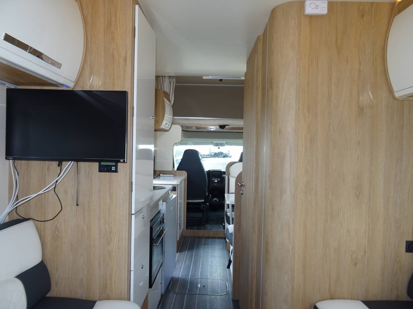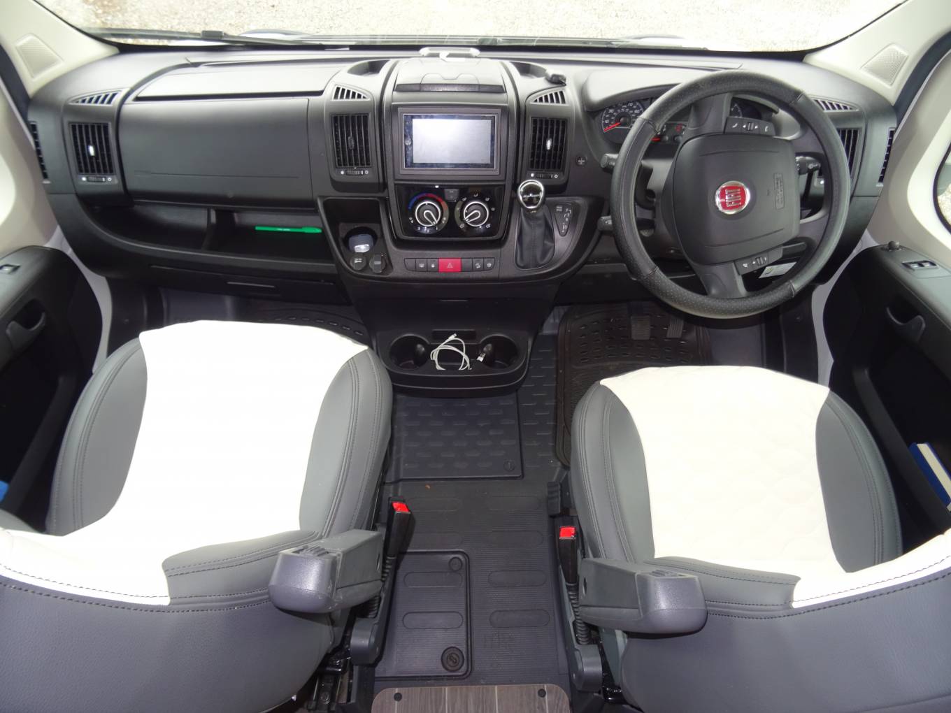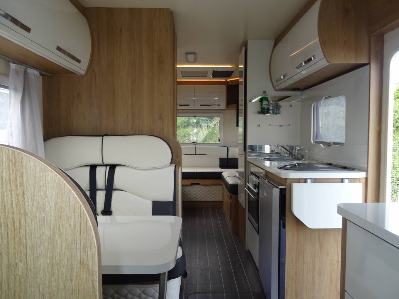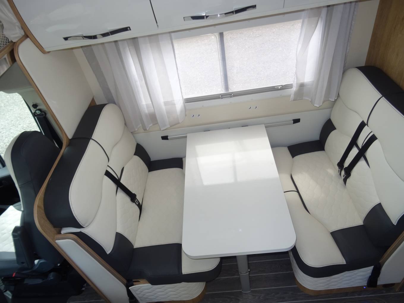 Dinette area with bench seating and swivel captains’ front seats