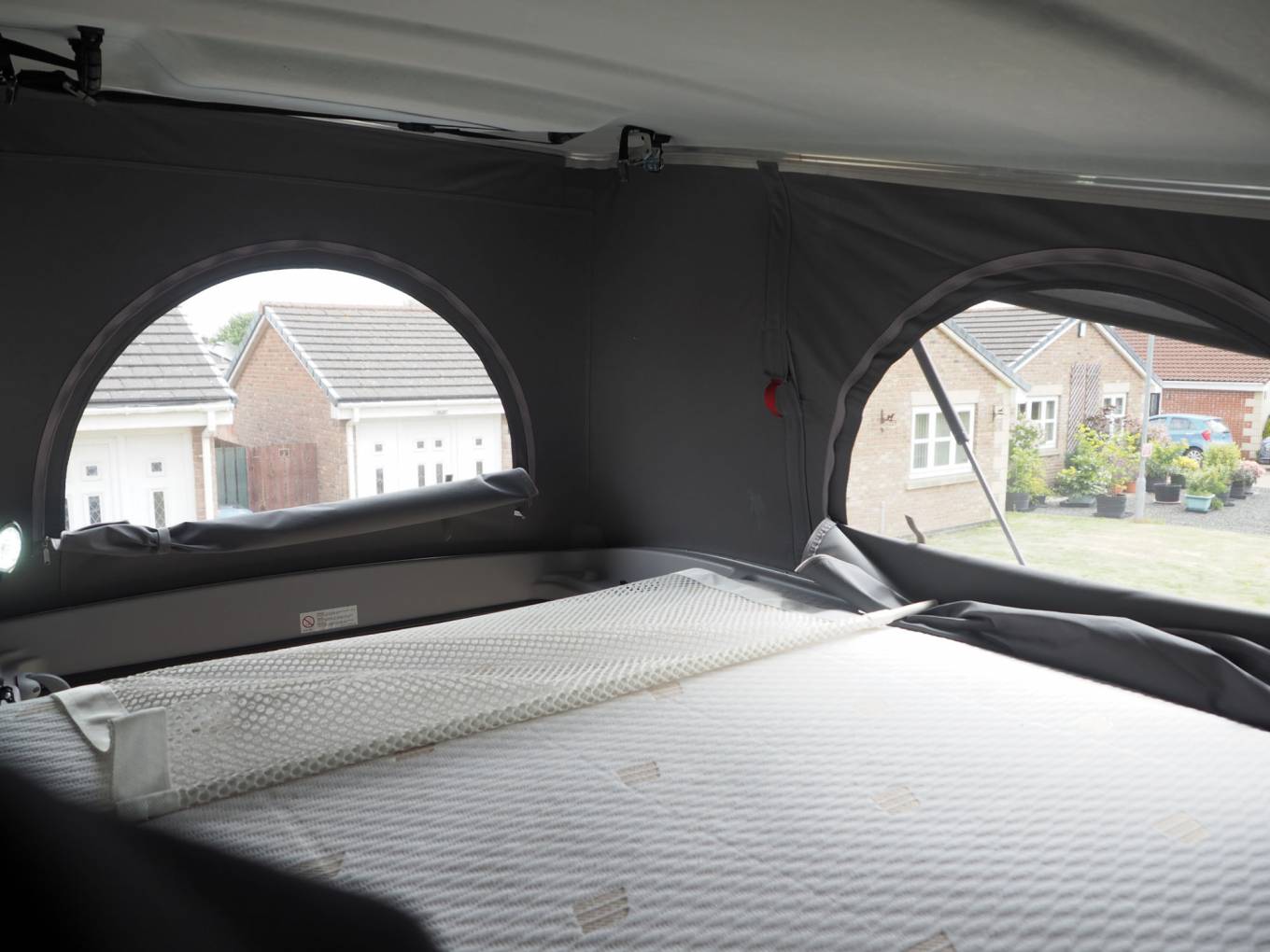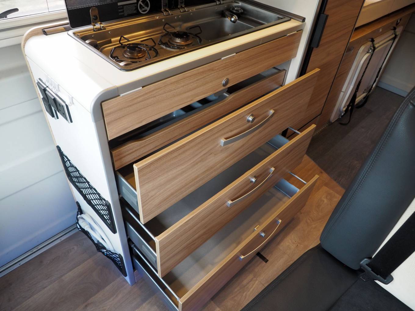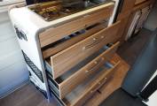 The 6 metre van layout is versatile with a fold up rear transverse bed over garage space with lashing points, cupboard and locker space, midships kitchen with sink, twin gas burners and generous fridge with freezer, washroom with tip up vanity sink, toilet and shower, forward dinette with leather and Alcantara upholstery, swivel cab seats and multifunction table, plus access to the large roof bed above. Fit and finish throughout is to a very high standard including the high lift roof, as is to be expected of the marque.