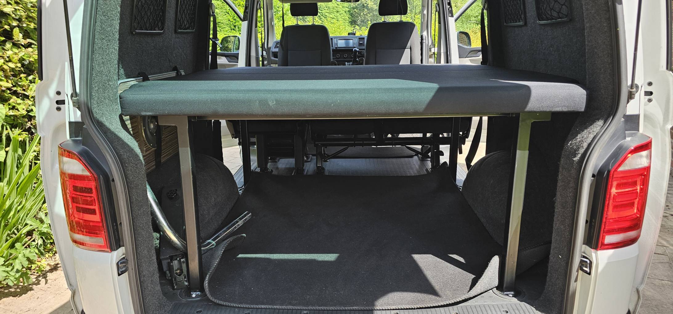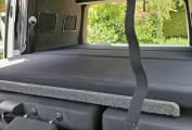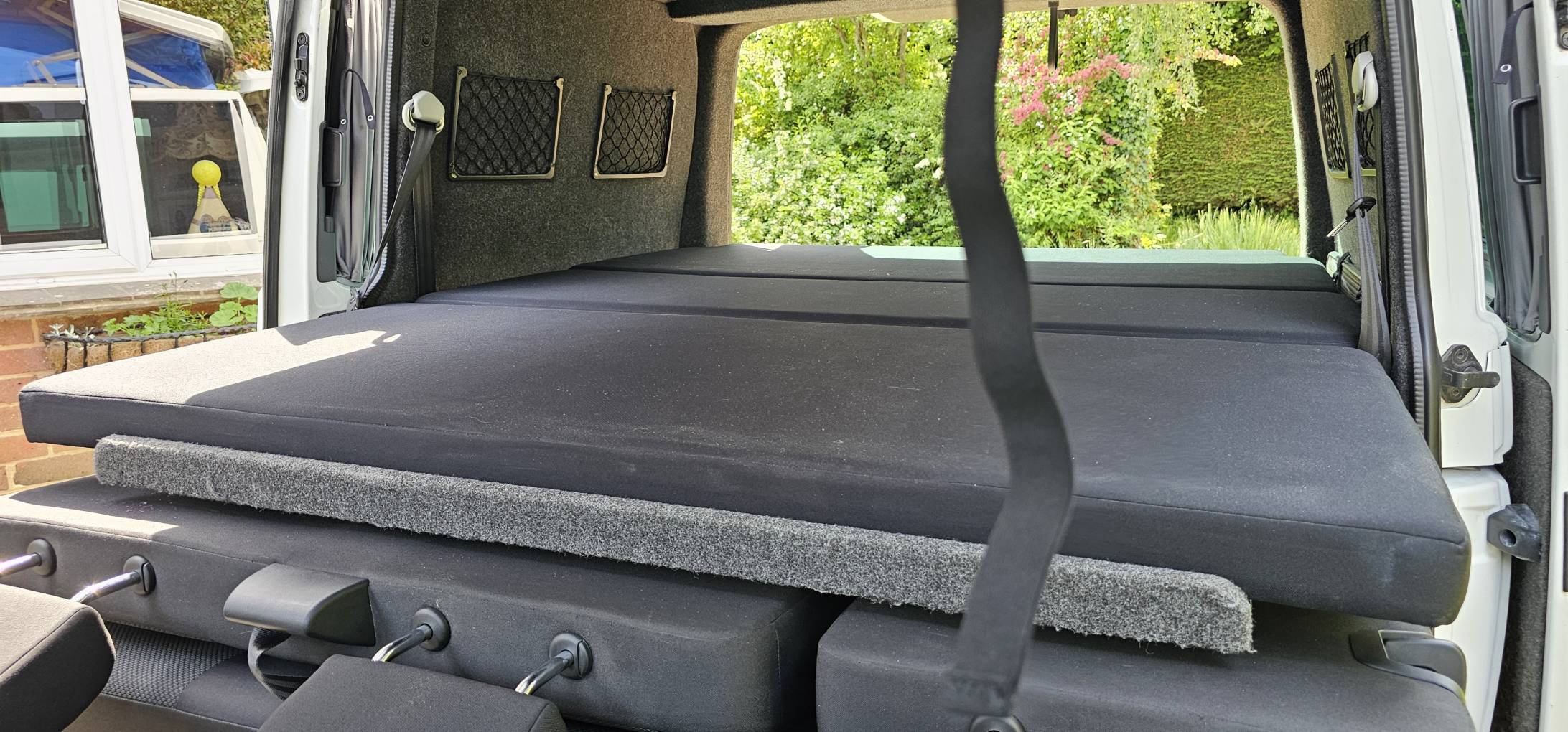 When the bed is deployed, simply fold down the rear seats and undo the large thumb screws to slide out the base section of the bed over the folded seats.