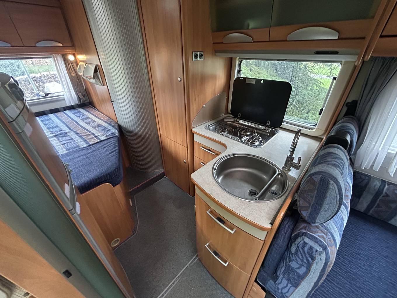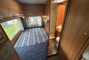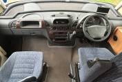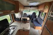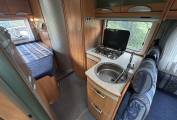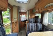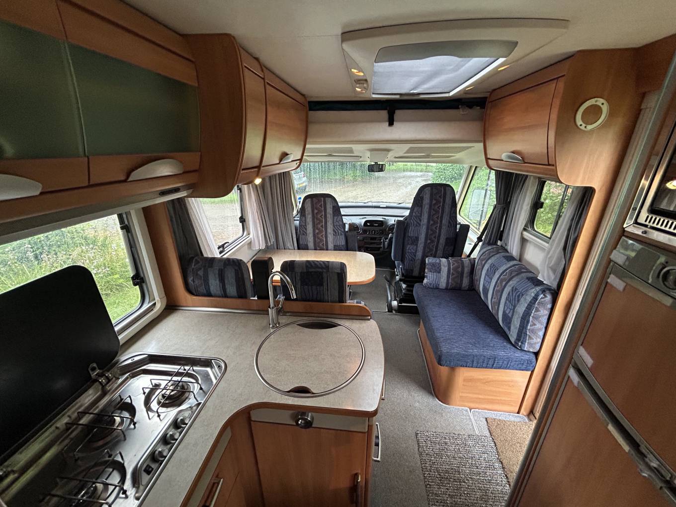 Mid habitation is the kitchen which is made up of 3 gas hobs, wash basin sink with hot and cold water, 3-way fridge with freezer space, oven and plenty of storage including a large wardrobe. Finally, towards the front of the Hymer we have the spacious dinette area made from one forward facing bench and a small side seat. This area also houses two additional 3 point seats belts and can be made into a seating area easily big enough for six by swivelling the front driver and passenger seats to face into the living area.
