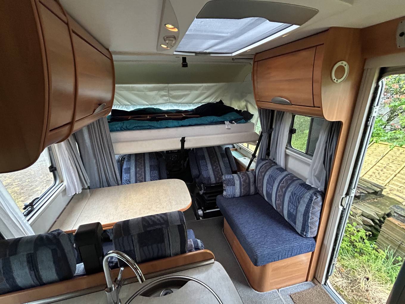 The inside is super clean and all the storage lockers come in great condition and give the Hymer a real homely warm feel. The Front drivers cab is spacious and clean and benefits from the ever-popular A-class feature of having a huge drop-down bed stored above it.