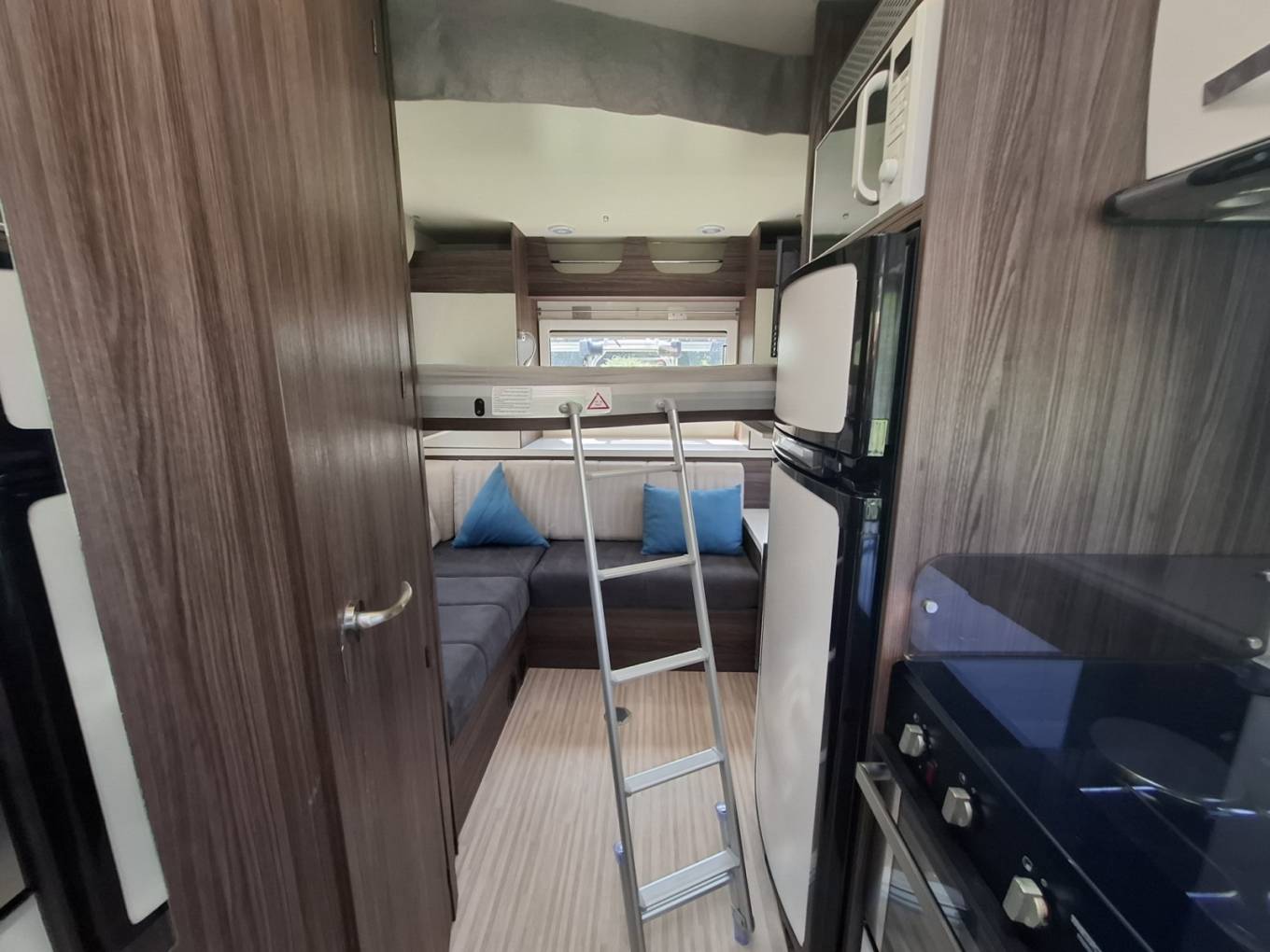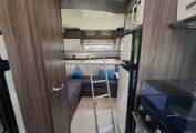 At the rear of the vehicle is a second L-shaped lounge, above which is another electrically operated drop-down transverse double bed.