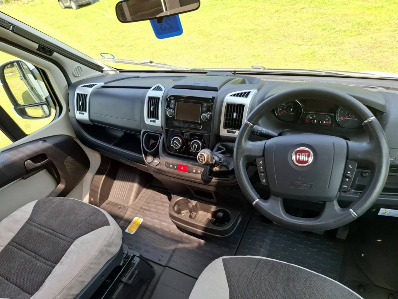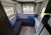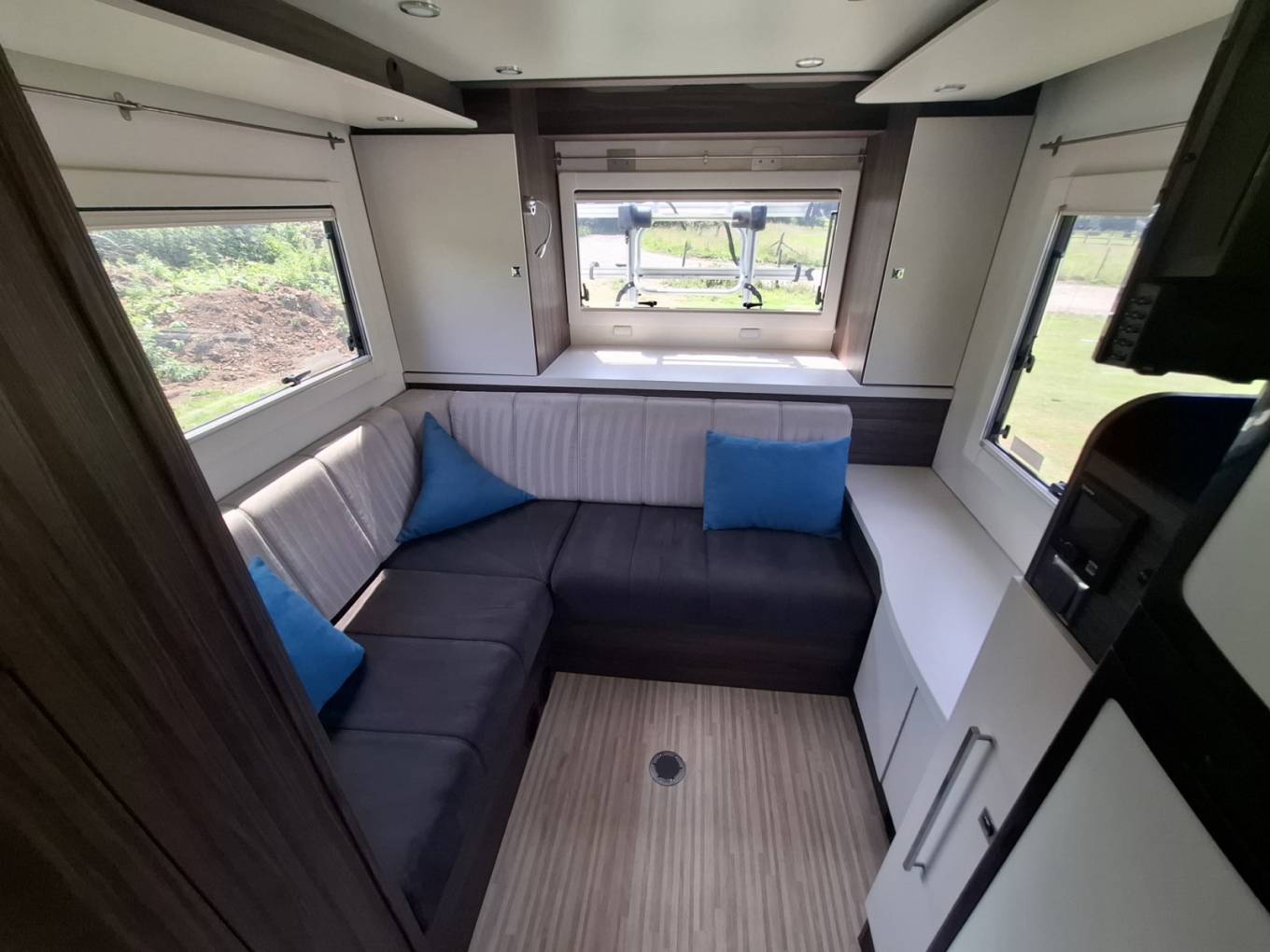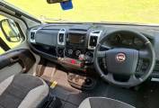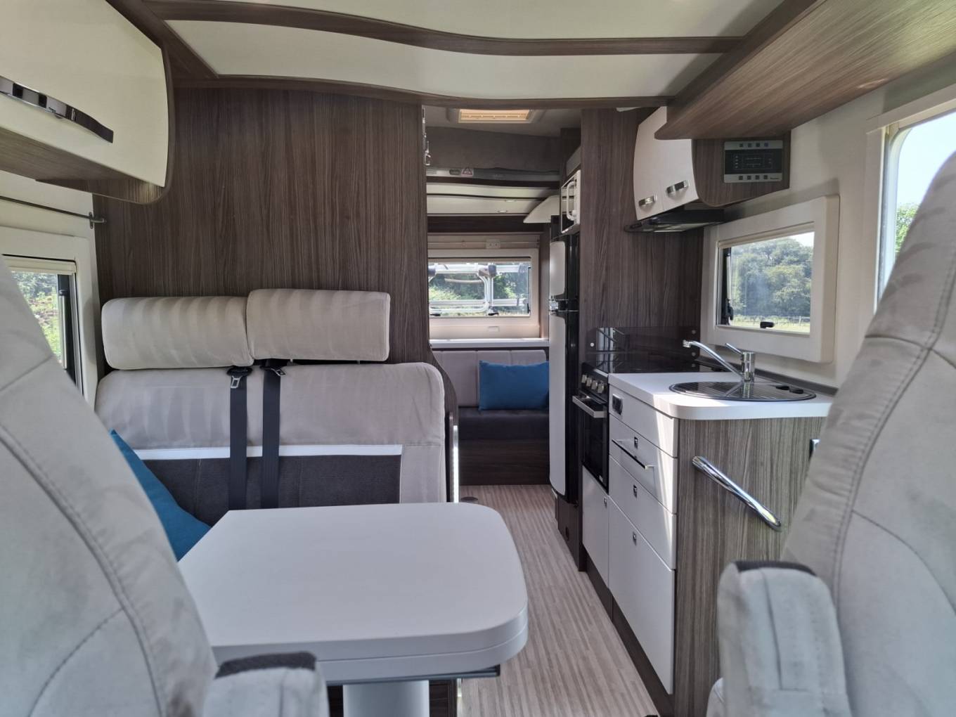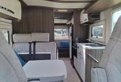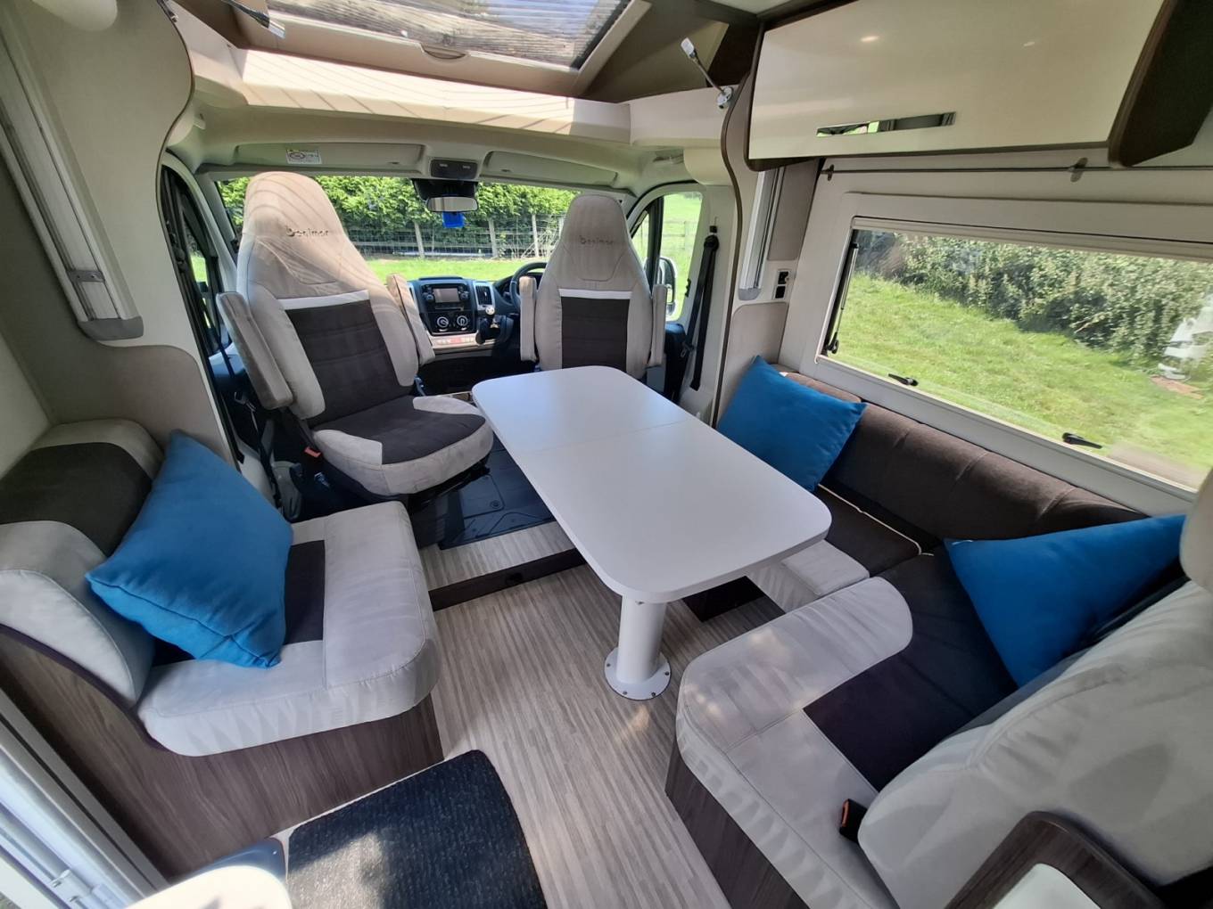Behind the driver’s cab position is a dining and leisure area with L-shaped seating (with two additional forward facing seat belts) and an adjustable folding table, plus an additional side seat behind the passenger cab seat.