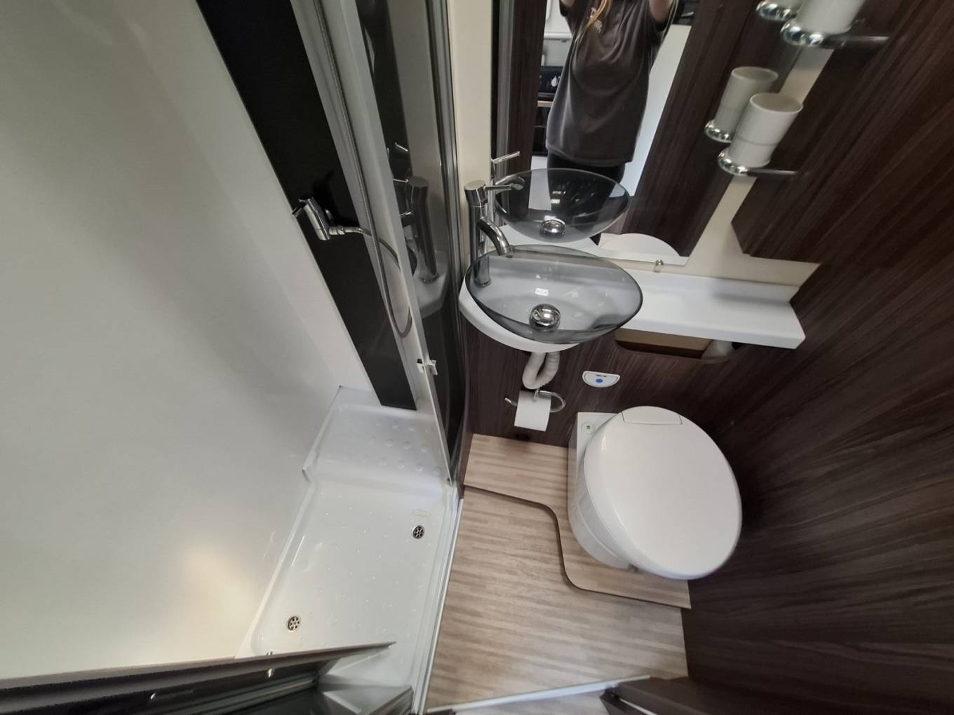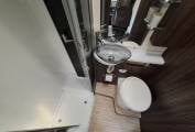 Beyond the nearside habitation door, and conveniently adjacent for food storage and preparation, is the central kitchen, with a hob with 2 gas burners and an electric plate, an extractor fan, a combination oven/grill, a sink, a fridge, a separate freezer, and a microwave.
