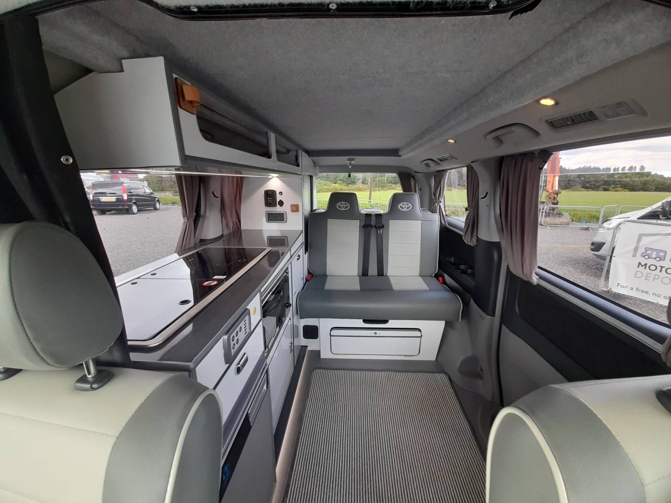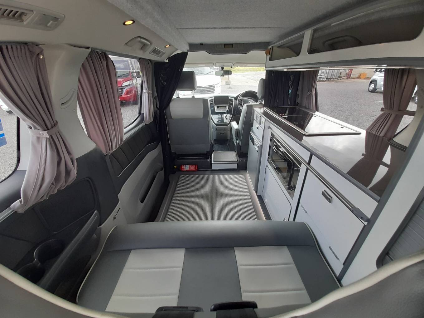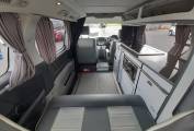 Living – Rear bench seat with 1 swivel cab seat, moveable table which clips on to the kitchen area, Spotlights and curtains on the windows.