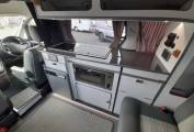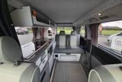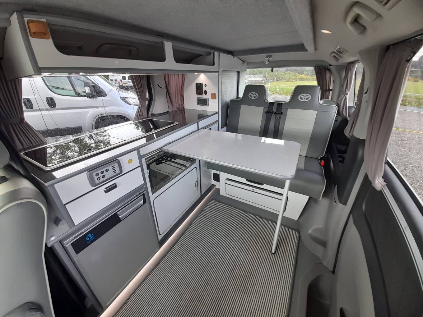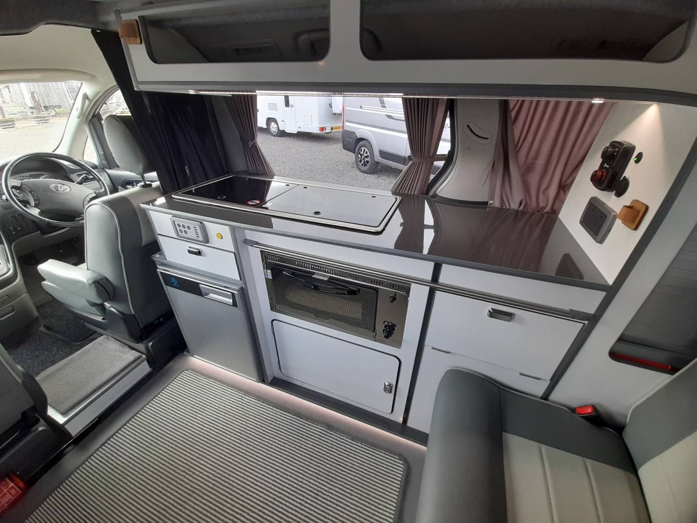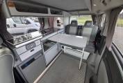 Kitchen – 2 x Gas ring burner, Sink with Cold running water, 12 v fridge, generous storage for a campervan.