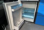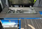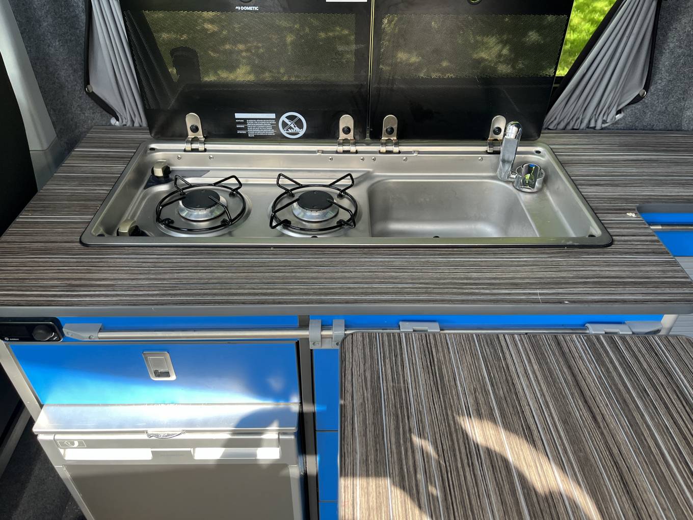 Dometic double-burner hob and sink unit, paired with a Waeco CRX50 12V compressor fridge.