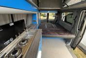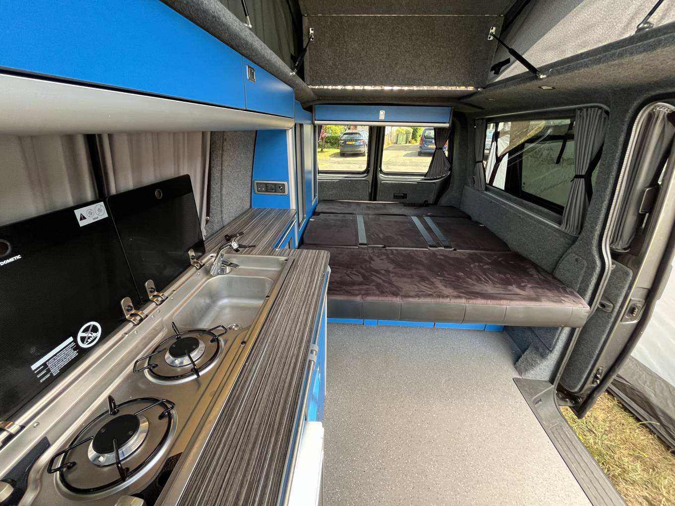 Westdubs elevating pop-top roof with integrated bed, transforming the van into a 4-berth camper.