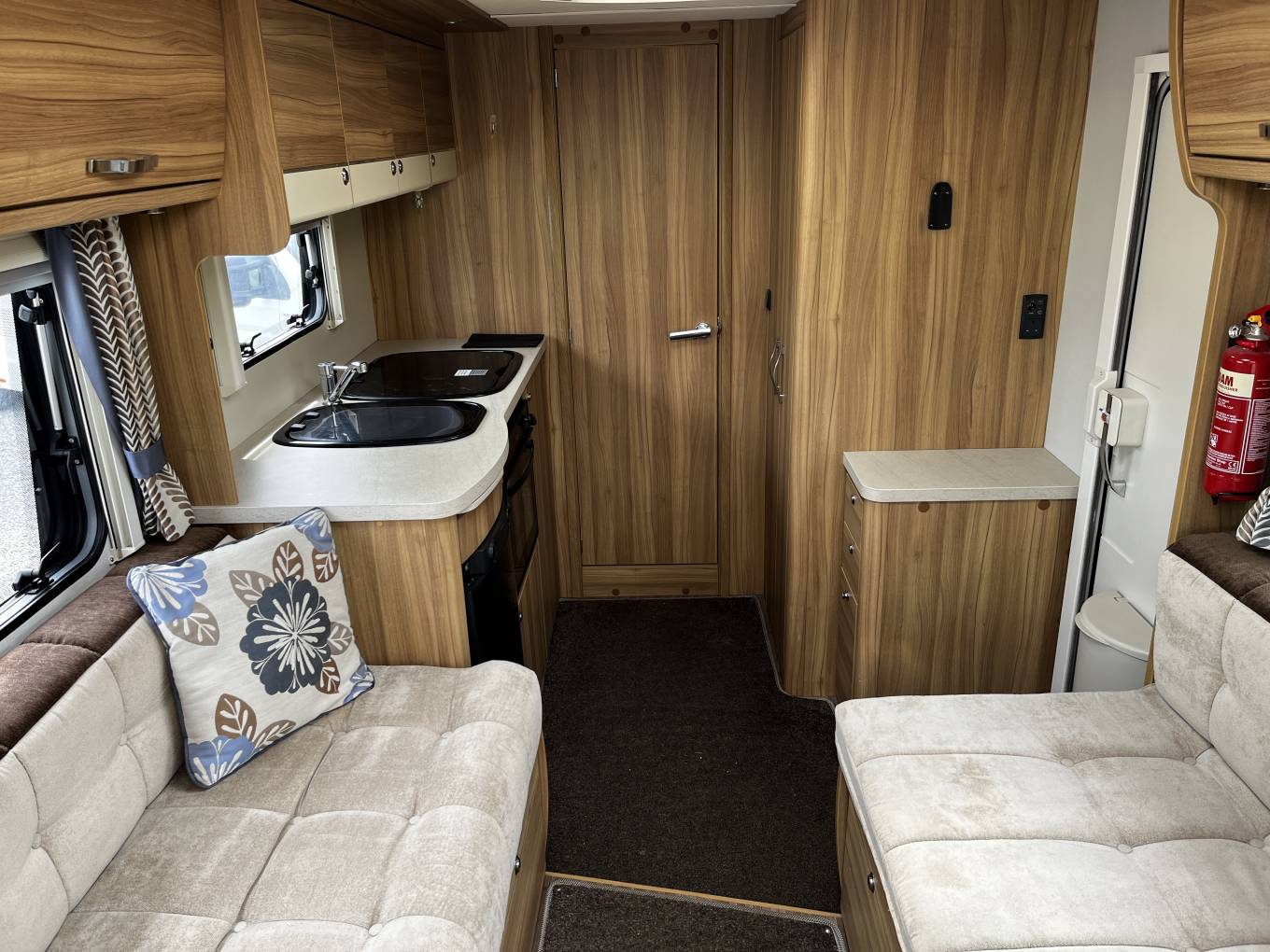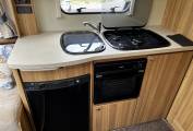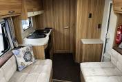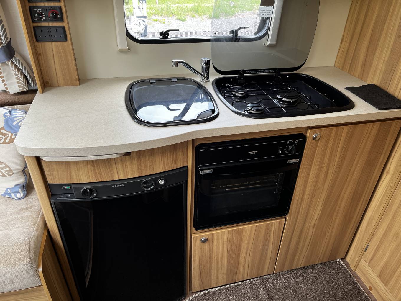 Kitchen – 3x Burner gas hob, Oven & Grill, Sink with Hot and cold running water, Dometic 3-way fridge freezer, generous storage for all your kitchen needs, 240v power plugs and lighting.