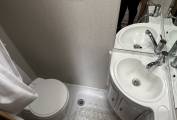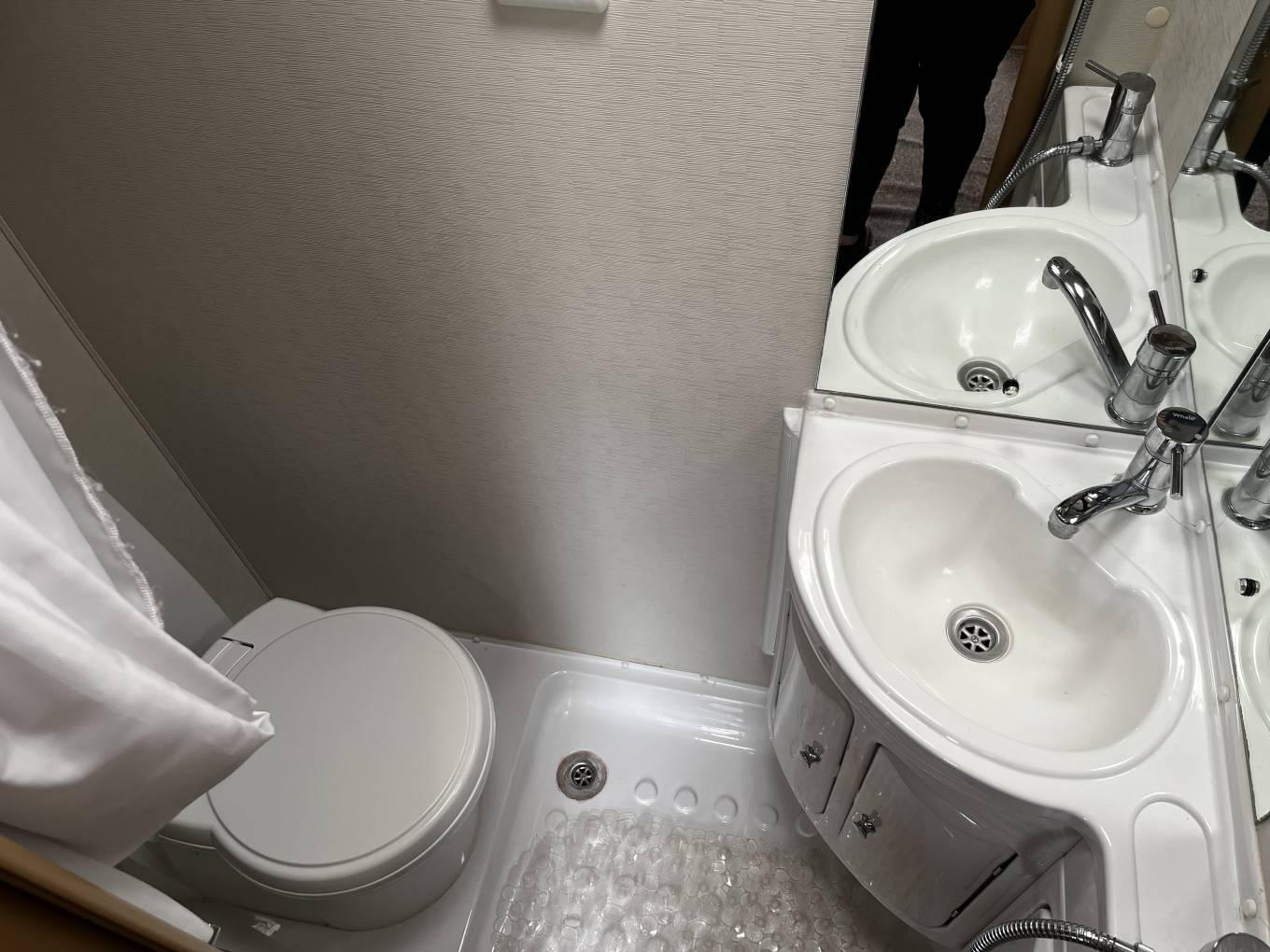 Washroom – Thetford electric flush toilet, wash basin and shower. large surrounding mirrors, accompanied with great storage underneath.