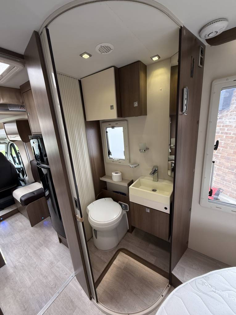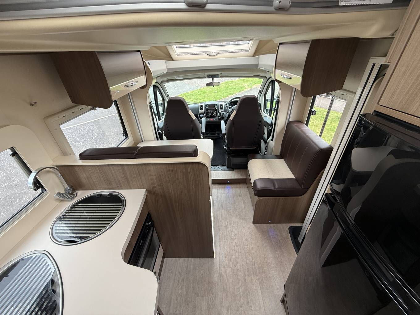 Upon entering the habitation area, you have a lovely modern lounge area with forward facing belted seats, along with a side facing seat, 2 cab swivel seats and a telescopic dining table. In the centre of the habitation area you have a well equipped kitchen with full size fridge and freezer, 3 gas ring hob, oven and grill, sink, with storage above and below. Above the fridge and freezer is one of the 2 TV's that this motorhomes comes with. In this area you have an electronic drop down double bed with safety netting and capable of holding up 42 stone in weight and to give you privacy you have a sliding door to separate the bedroom to living lounge area.