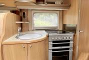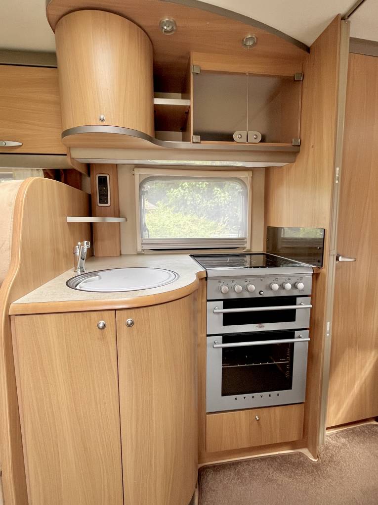 Behind this area we have a well equipped kitchen comprising of Sink with hot / cold running water, 4 burner hob ( 3 gas 1 electric), separate grill and separate oven, above the kitchen area are two large cupboards, one with 3 pin socket which could easily accommodate a microwave if required, below the work surface is further storage including internal carousel shelving. Opposite the kitchen is a large fridge with separate freezer compartment above.