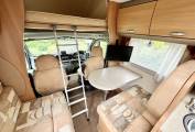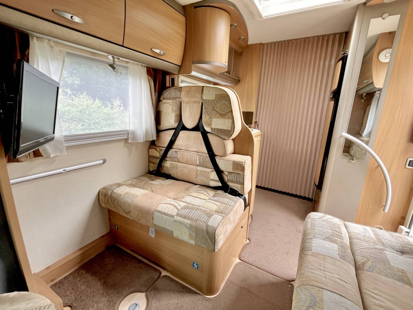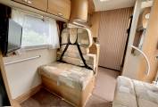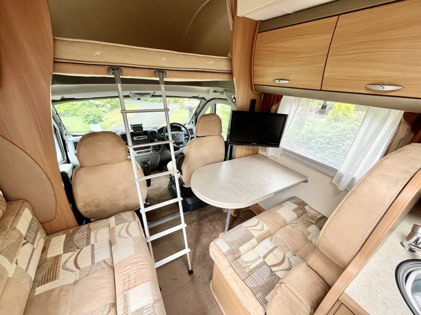 Once inside you will see the large spacious dinette and socialising area comprising of a large single bench seat with good storage underneath and opposite a further bench seat also with storage below, this area has two 3 point seat belts allowing 2 rear passengers to travel in safety when needed, there is an extendable dining table which can be removed when not required along with a Tv and bracket and further overhead lockers for storage. As we stand in the dinette lounge we can see the large overcab bed and storage for the access ladder. This large bed space .can also be used as an additional storage area. Below in the spacious cab we have twin swivel captains seats, radio, bluetooth, reverse camera, satellite navigation, and full cab blinds.