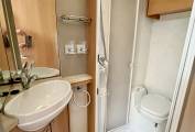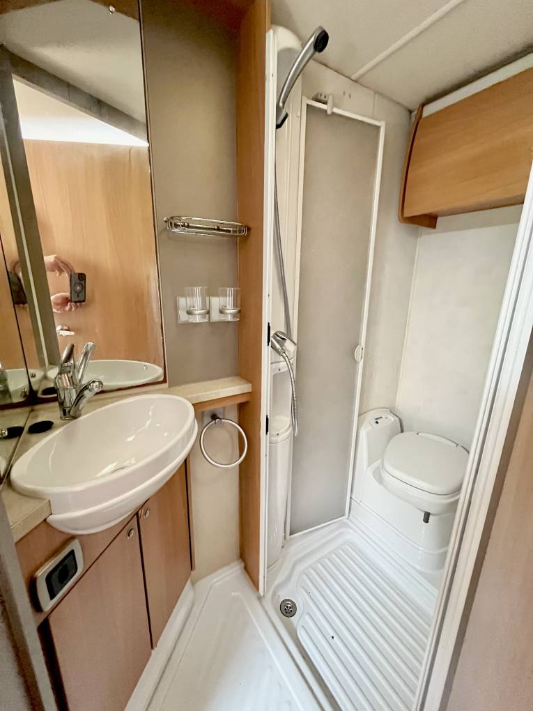 To the rear of the van we have a good sized french bed complete with under bed storage and further access via an outside locker door, above the bed are three good sized storage lockers and a shelf for Tv with aerial socket and bracket. To the side of the bed area we have a very good sized hanging wardrobe with shelving below and a pull across blind to separate the lounge / dining area from the bedroom / washroom area. The spacious bathroom is complete with shower, folding shower screen, thetford cassette toliet, wash basin with mixer tap, under sink cupboard, mirror and further overhead storage locker.