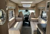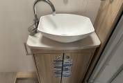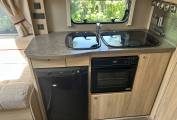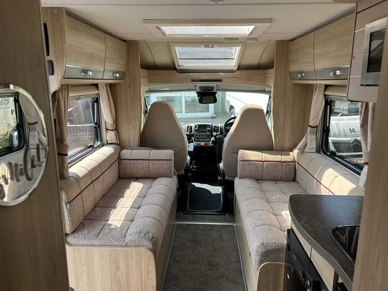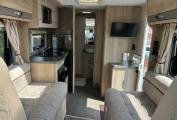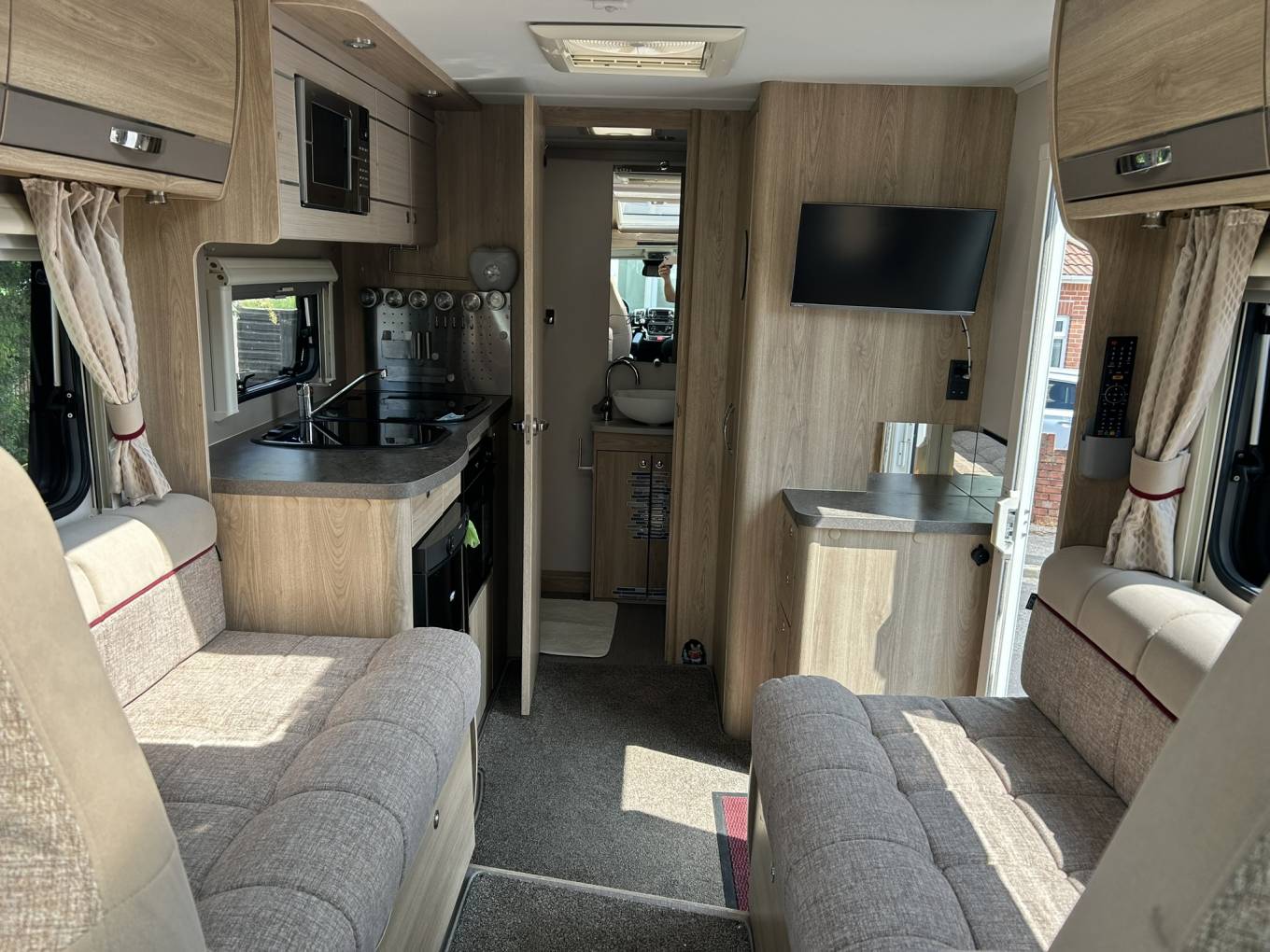 As you enter the van there is a well equipped kitchen comprising of 3 way fridge, oven and grill, microwave, duel fuel hob, sink and mixer tap. There is plenty of locker/cupboard space for all your kitchen essentials.