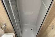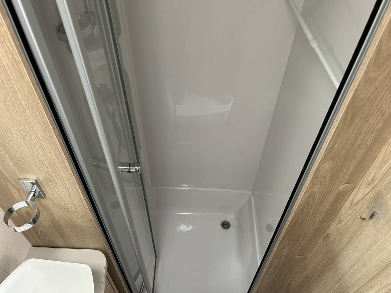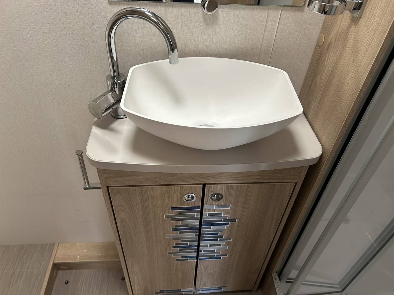 To the rear of the van there is a large modern washroom comprising of shower cubicle, cassette toilet, hand basin and tap, vanity unit and mirror.