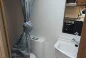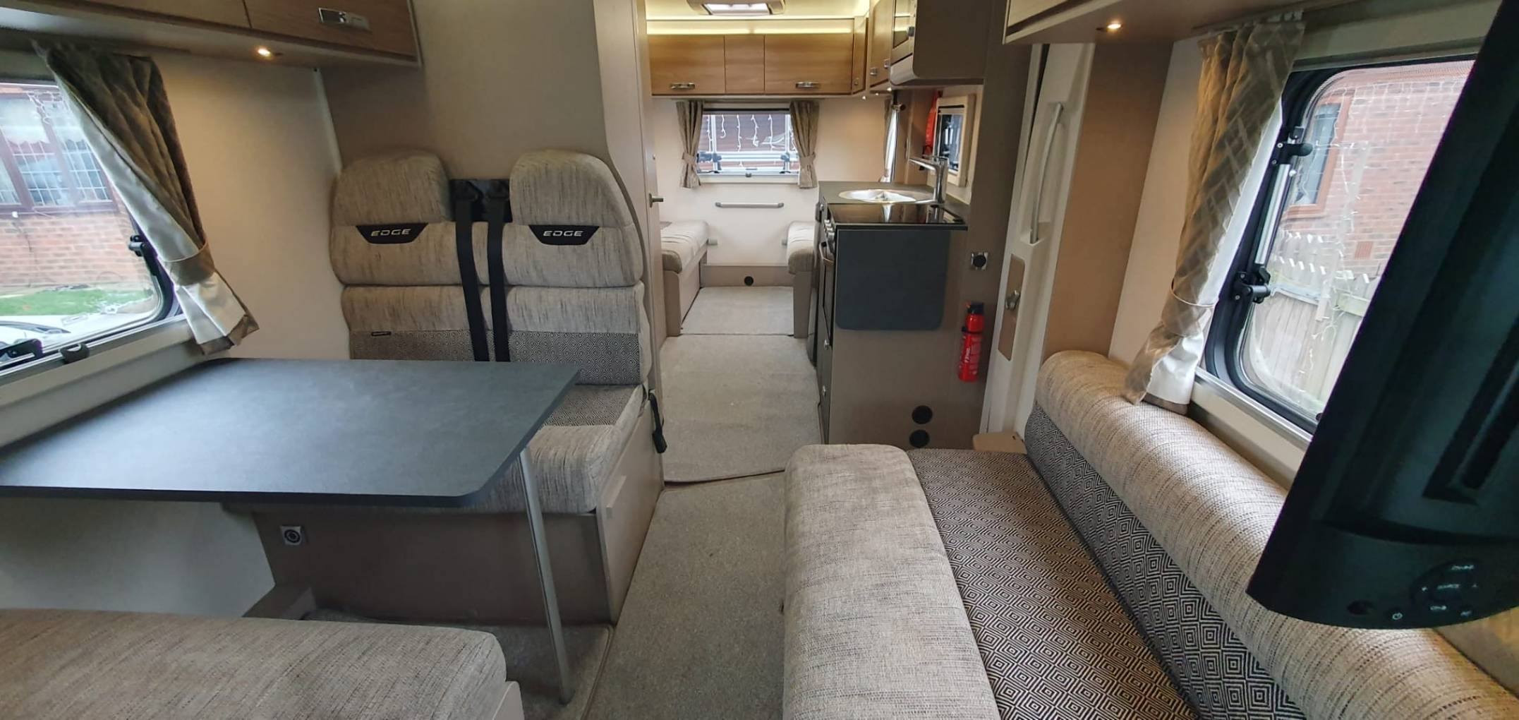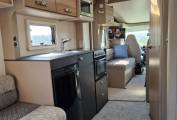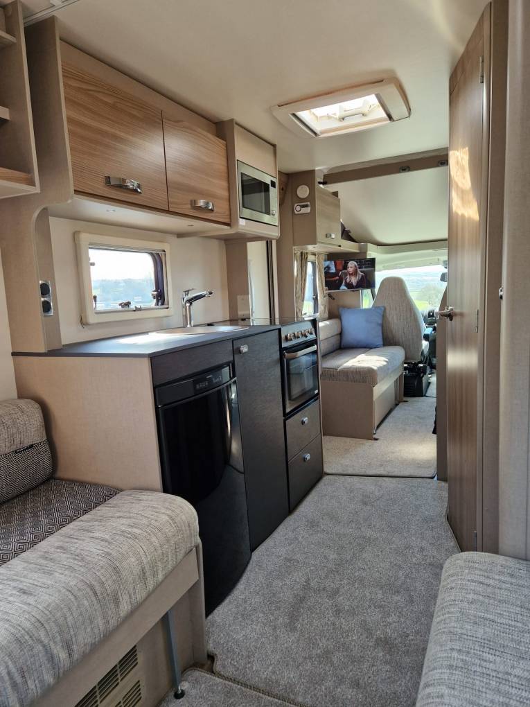 There is masses of storage space throughout the vehicle. The mid section comprises the kitchen with a fridge-freezer, three gas burner hob, and oven/grill combination and a microwave, great prep space and a pop up shelf to add to extend this too.