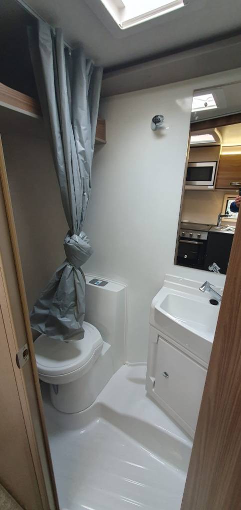 The washroom is gleaming, and offers a shower, pedestal loo, and hand washbasin, and cupboard storage. Blown air heating throughout with a Truma system, and pop fitting internal thermal blinds to the cab to keep you snug.