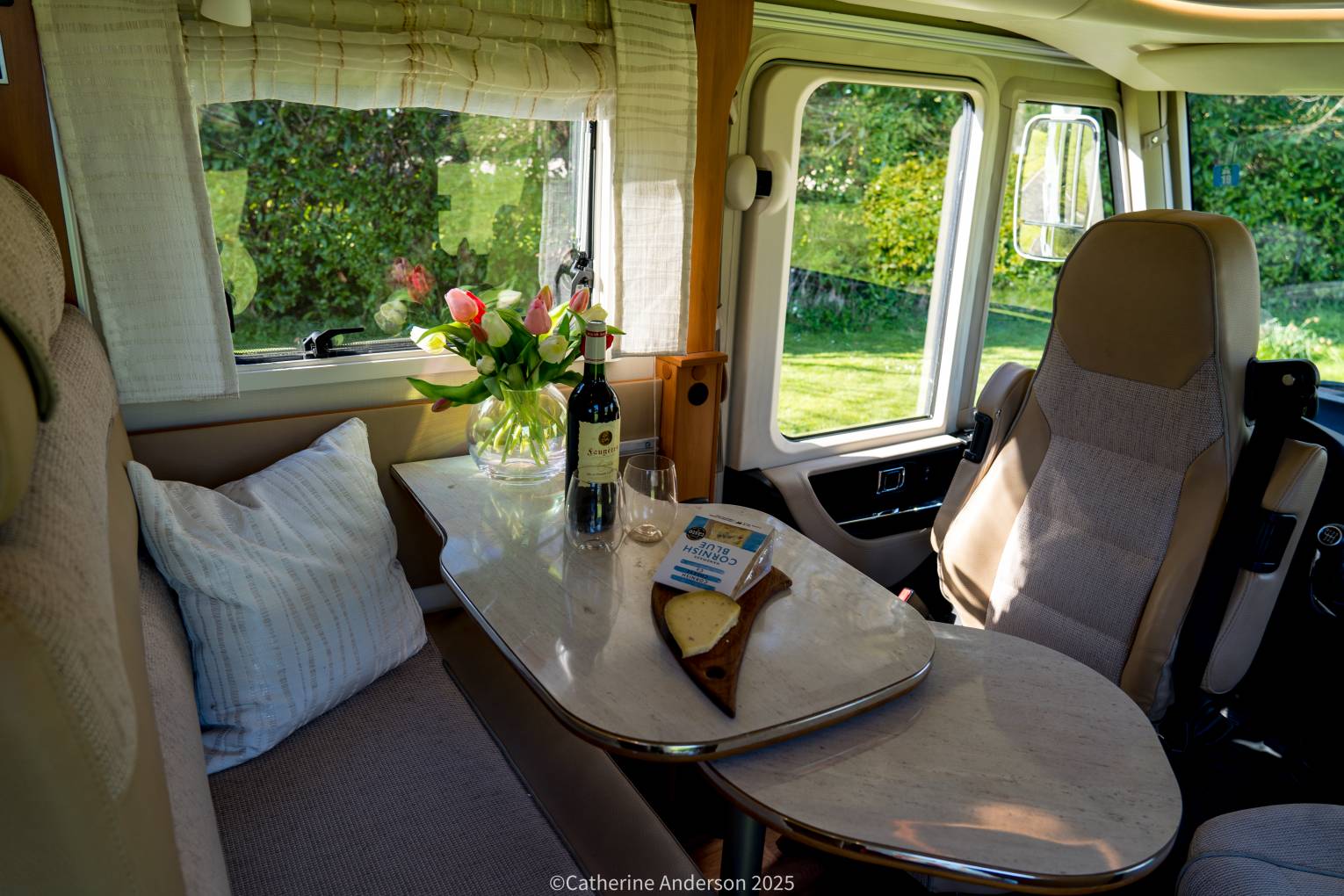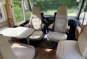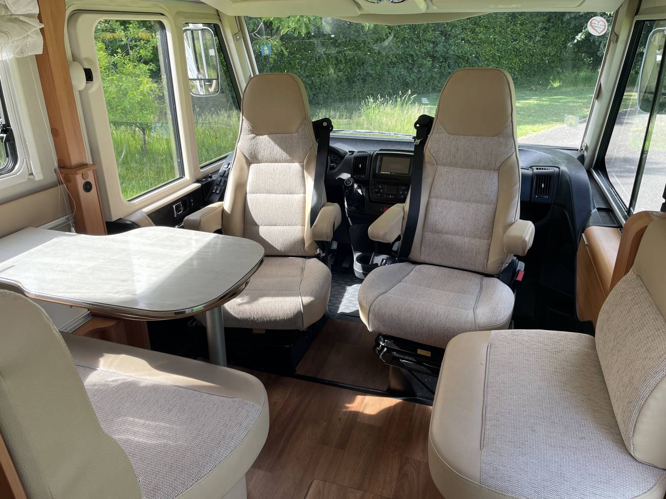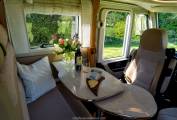 The lounge area features twin Captains seats that swivel to face an extending dining table, a 2-seater sofa (fitted with two seat belts) and a side-facing chair on the passenger side. This area allows five people to dine or relax in comfort.