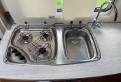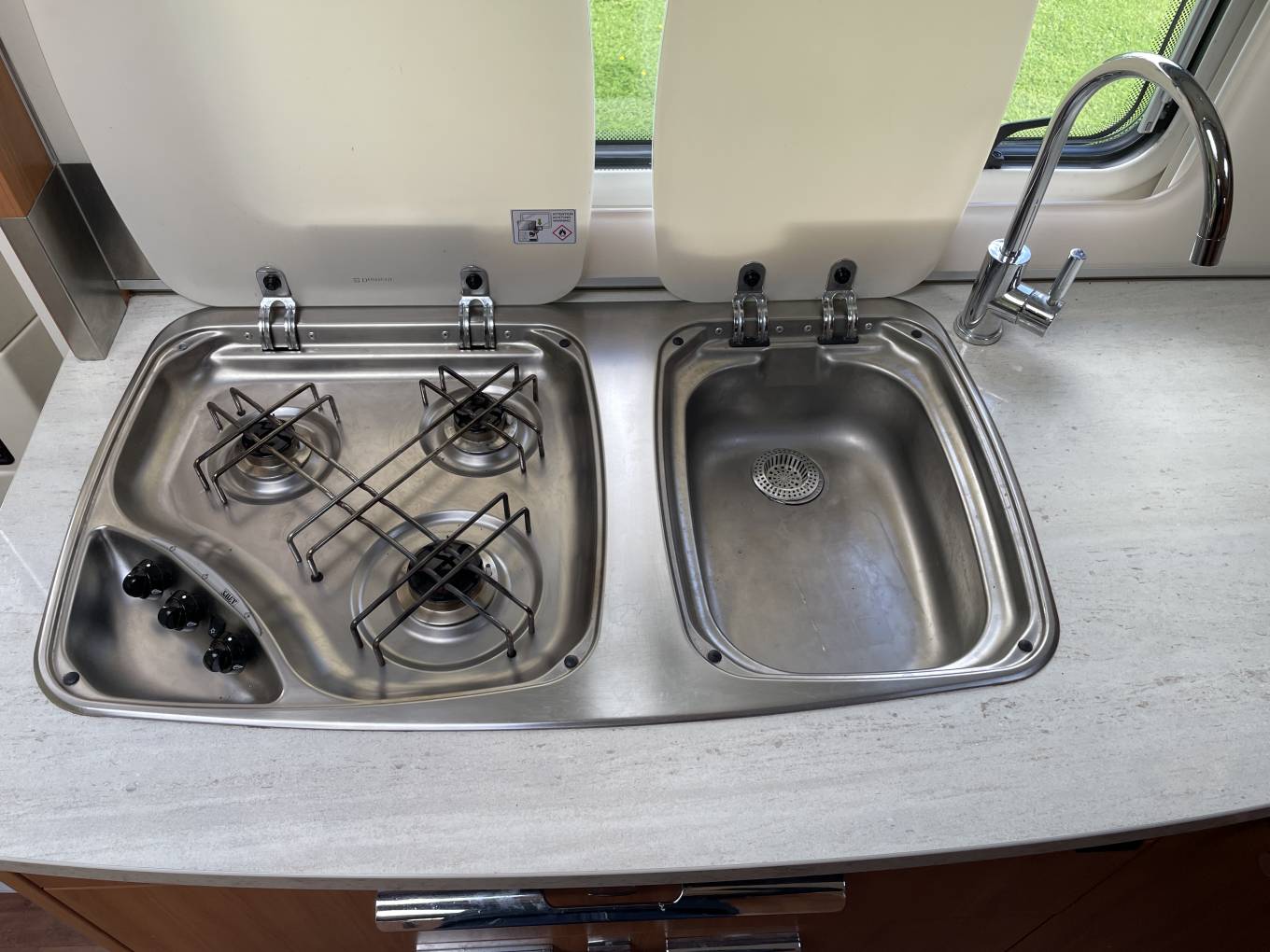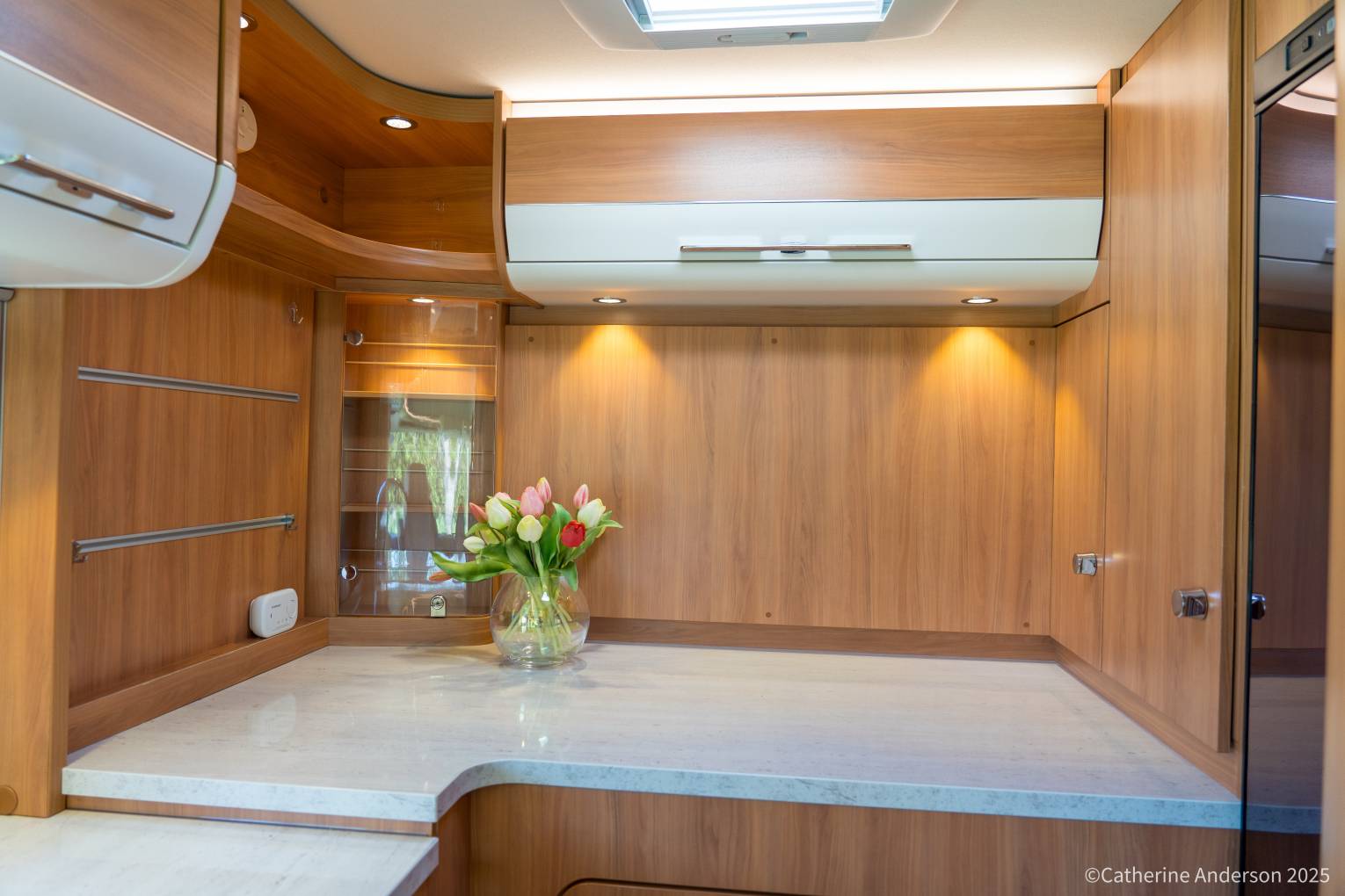As a European designed tourer, the kitchen has a hob but not an oven or grill, as the outside lifestyle is preferred. Opposite the kitchen is a full-size fridge freezer with automatic selection, complemented by ample drawer space. The kitchen also features a large rear kitchen surface for preparing meals, additionally, there's a slide-out larder for added convenience. All drawers and storage compartments are soft close, ensuring smooth operation.