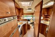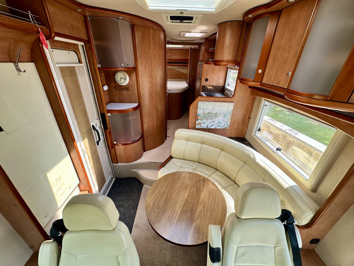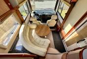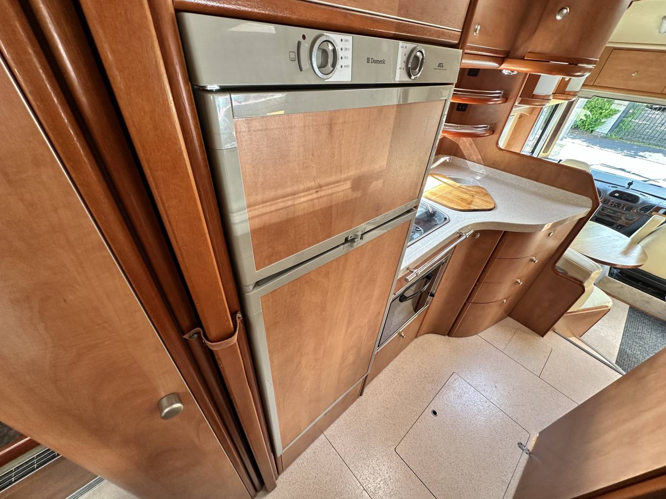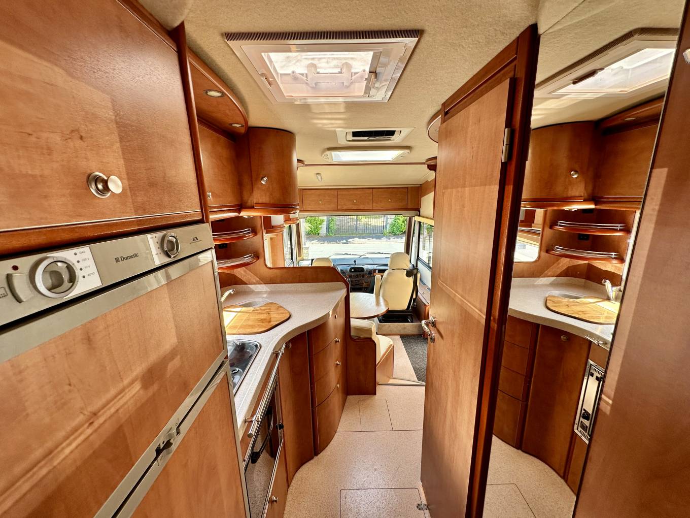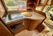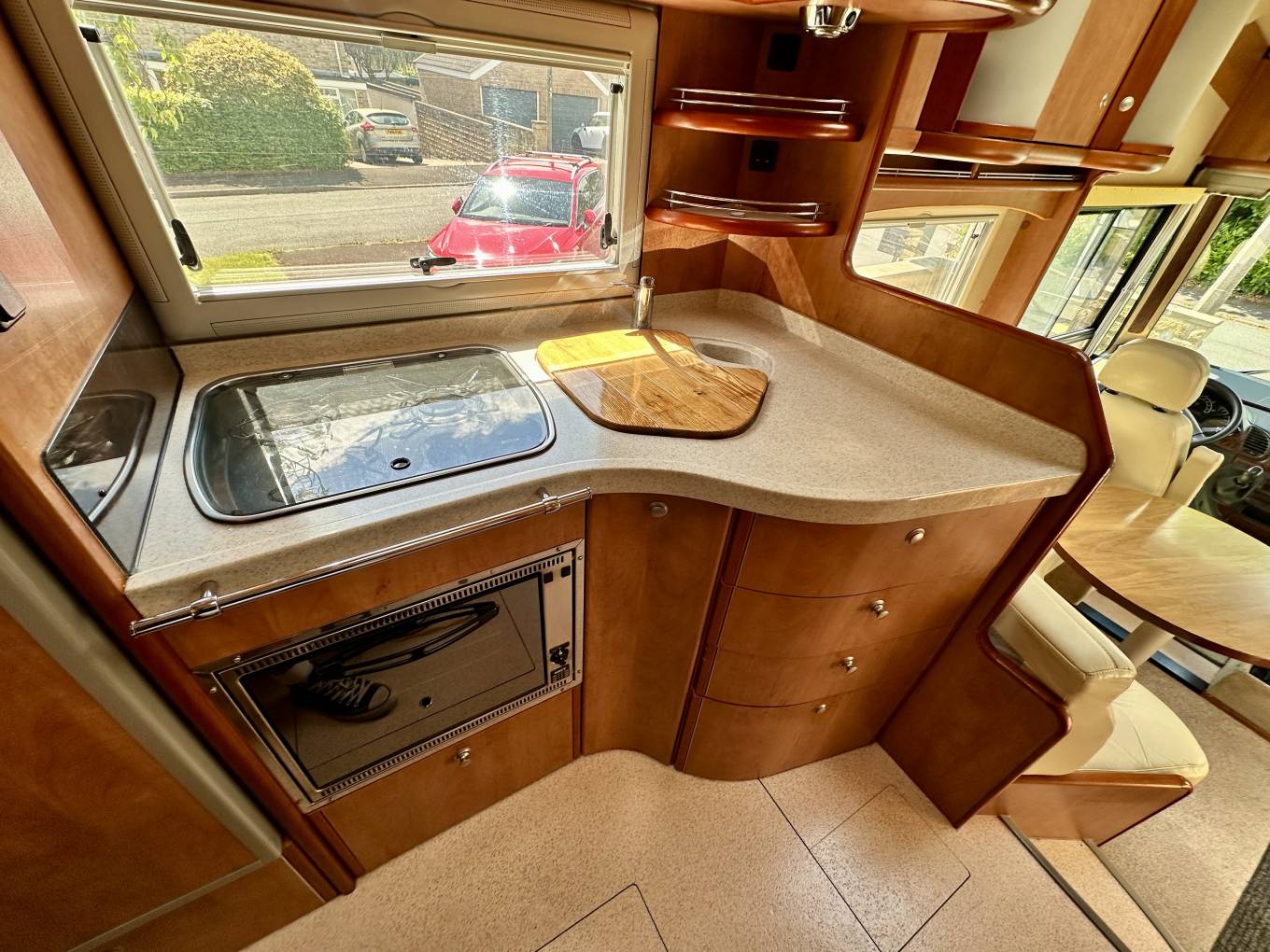 Starting at the rear of the motorhome, there is a generous, comfortable fixed bed. The sleeping area and washroom can all be separated by a privacy door. The washroom area includes a Thetford cassette toilet with electric flush, a wash basin with mixer tap, vanity storage, large mirror and walk in shower cubicle. Moving forward you will find a well equipped side kitchen including a three ring gas hob, SMEV gas oven, sink with salad prep work surfaces and mixer tap, a Dometic automatic power source fridge and separate freezer. In the heart of the motorhome, you will find the light and airy lounge living area. The upholstery is mid-cream leather with a large wood style topped dining table ideal for dining or socialising along with two sumptuous swivel captain seats. There is bags of storage throughout this Motorhome including cabinets and a good sized wardrobe. Outside there is a full width rear garage including an outside shower unit.