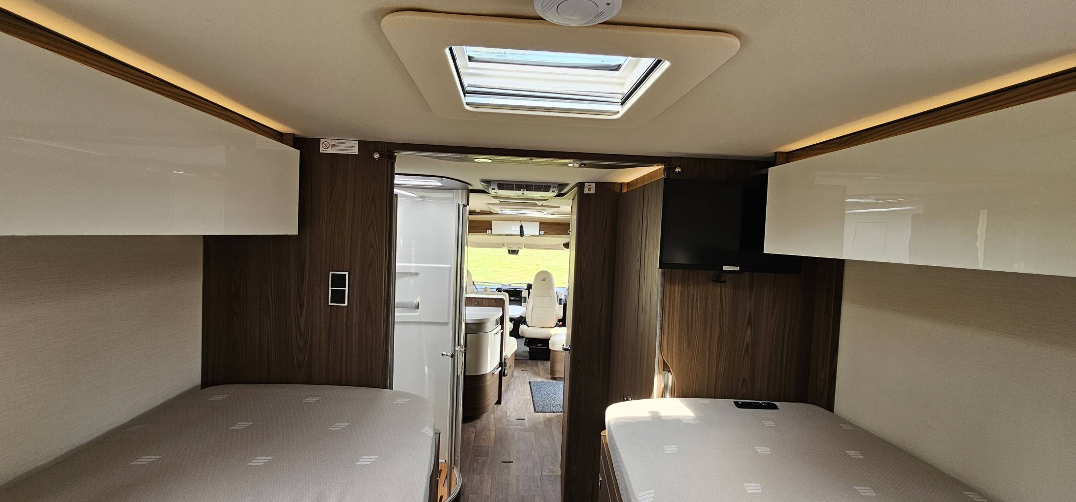 8.9 metre motorhome with twin rear single beds over a large garage and electric drop down in the cab / lounge area. Great condition throughout, ceramic coated. Over 40K worth of Hymer optional extras.