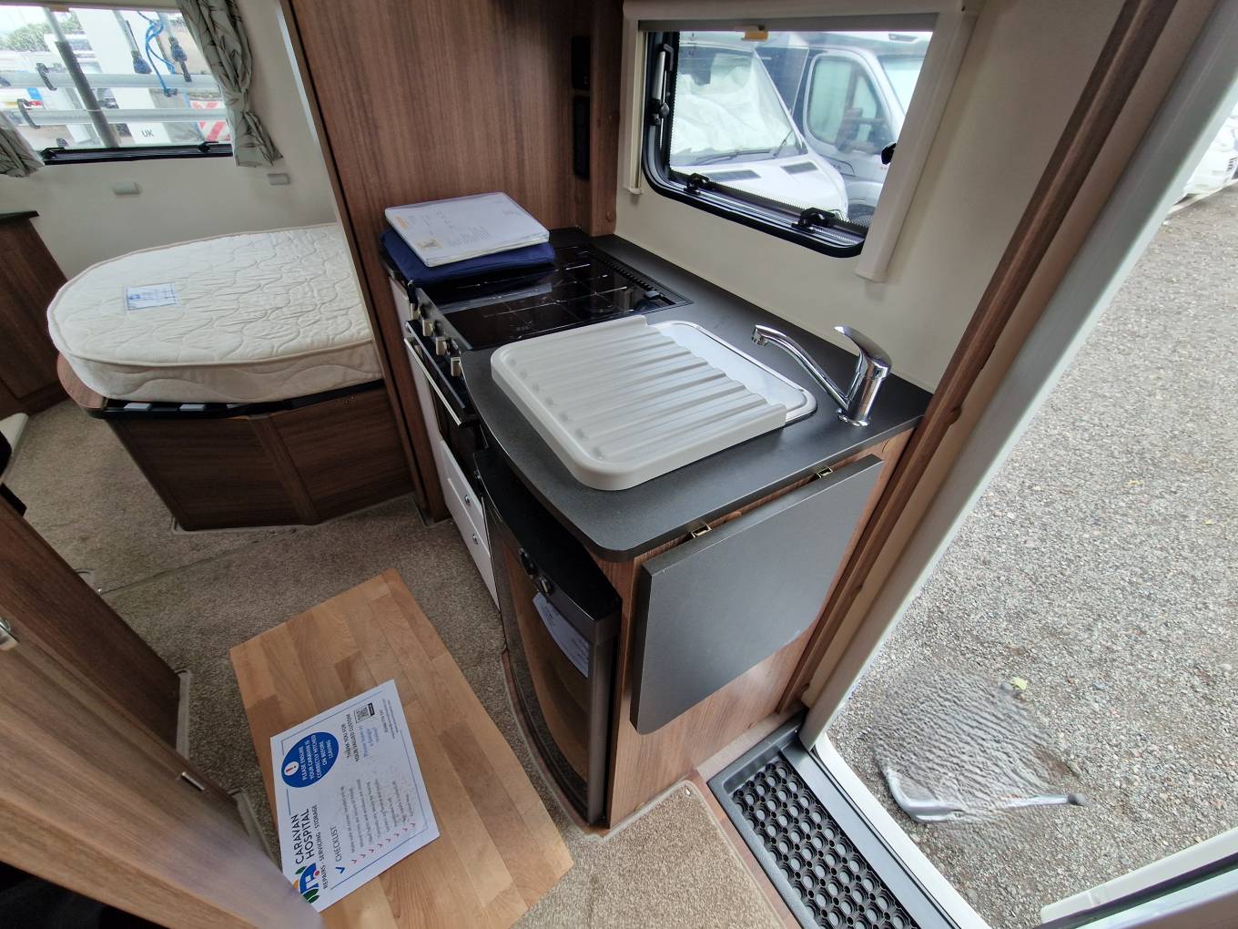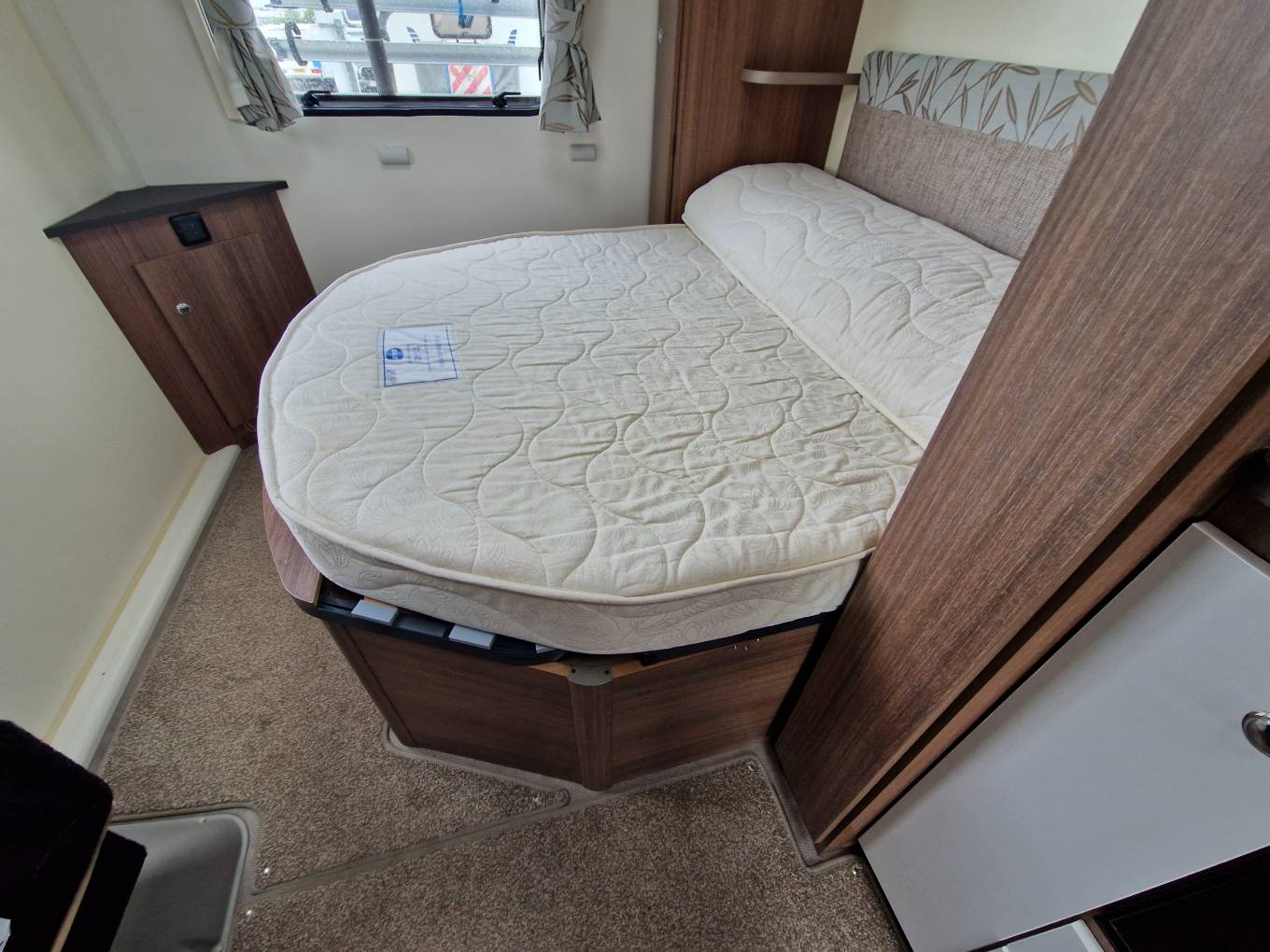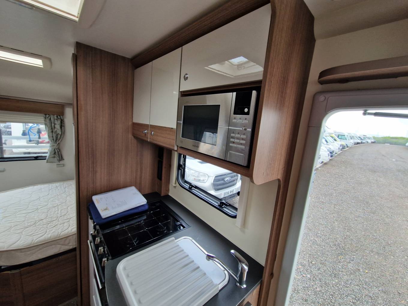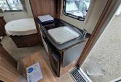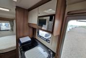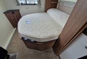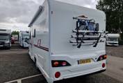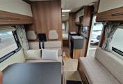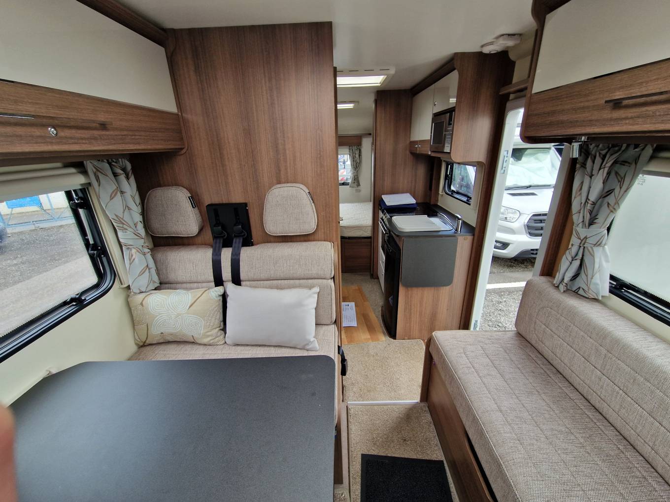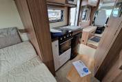 The layout is excellent on the 74-4 with a front lounge and dining area which converts to double bed, central washroom and kitchen, rear transverse fixed island bed which extends to give a greater sleeping area.