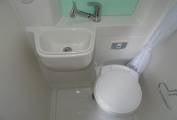 Opposite is the bathroom where you will find a Thetford flush cassette Toilet, a Wash Handbasin a Shower Unit and a Mirrored Vanity cupboard.