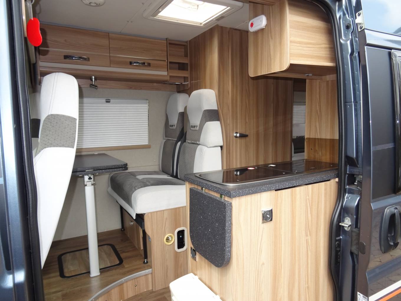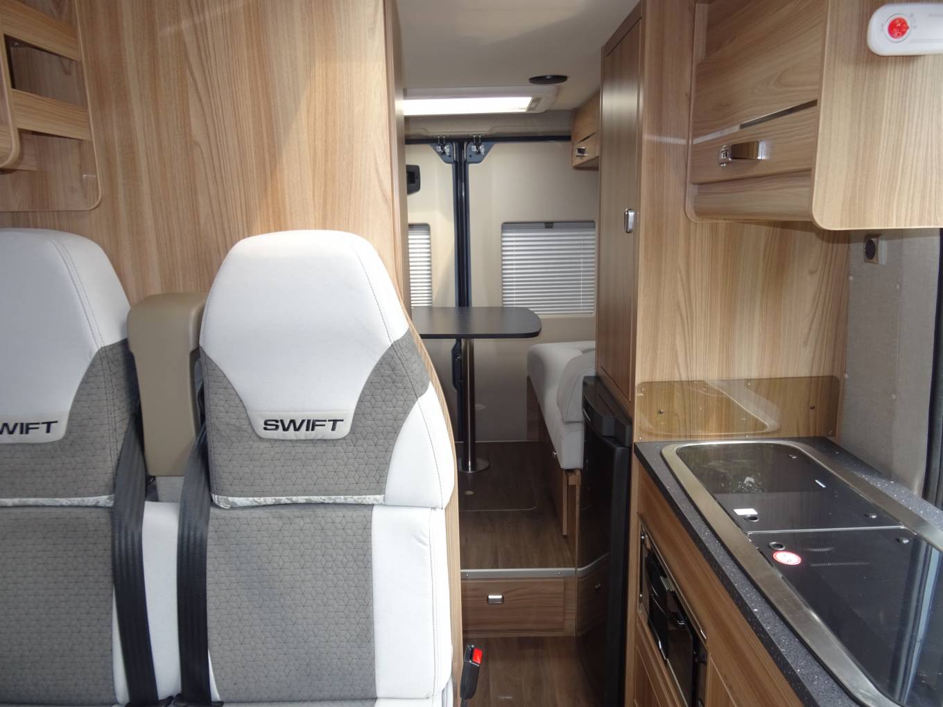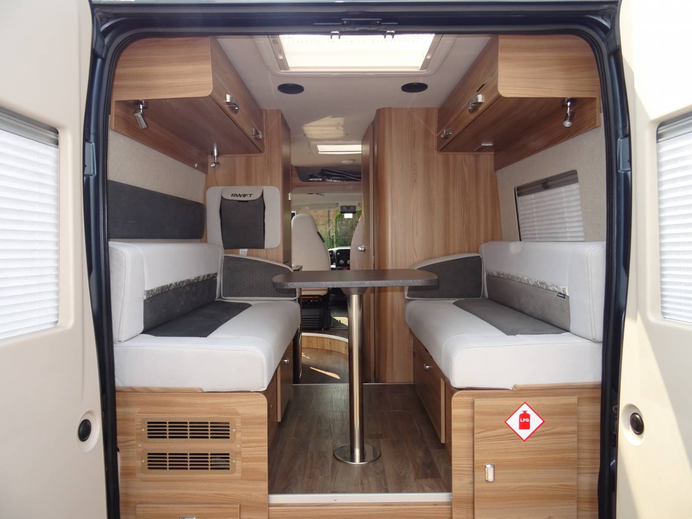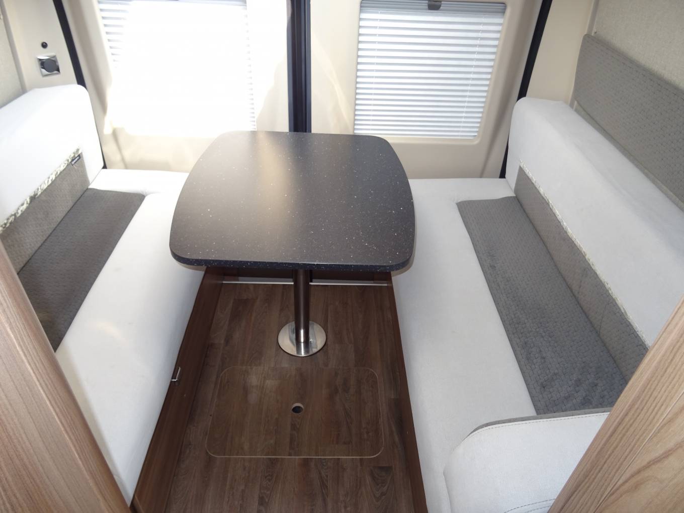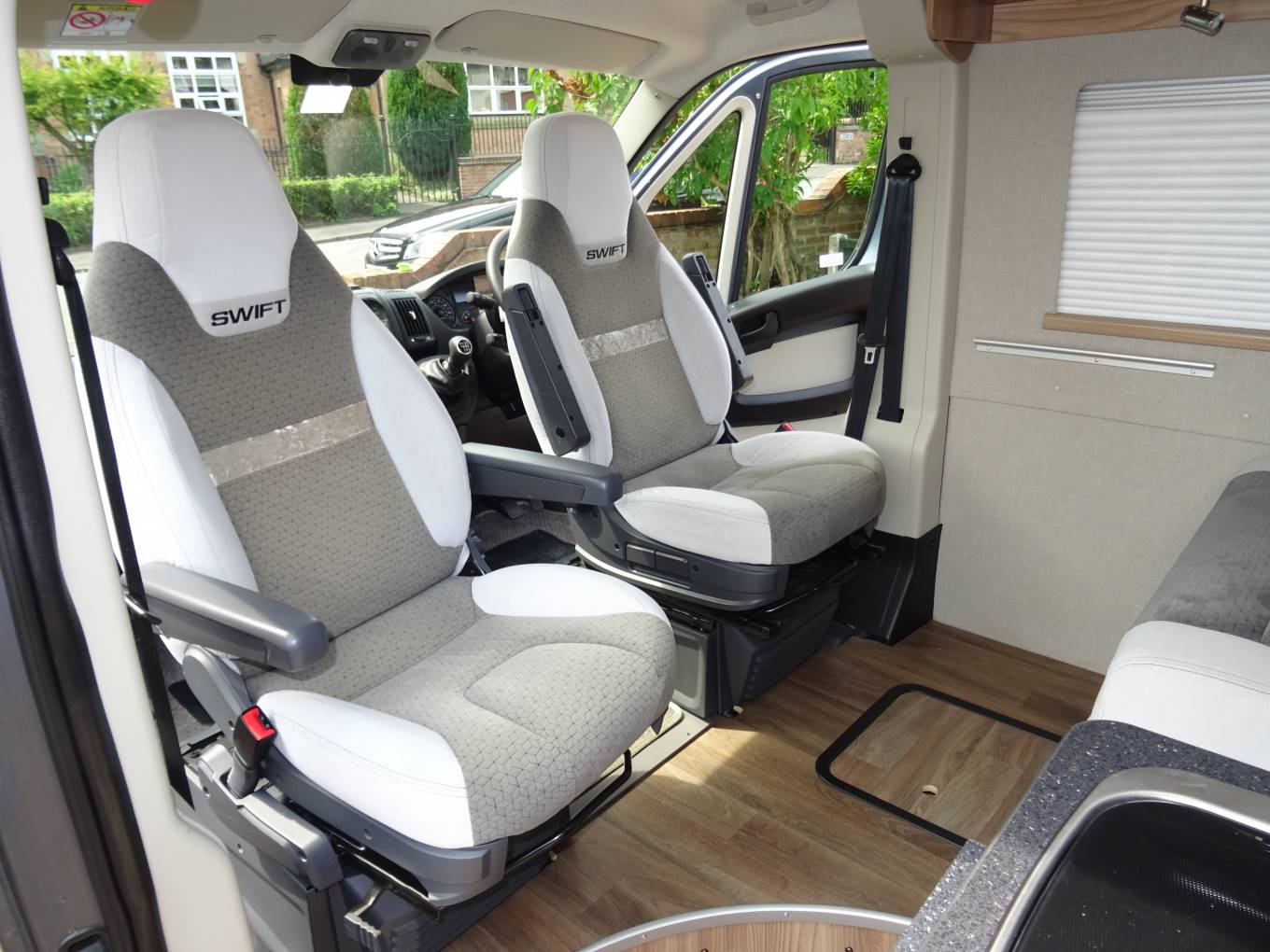 Here both the Cab Chairs spin round to face the twin forward facing seats with belted seats, centre is a removable and extendable table is ideal for dining.
