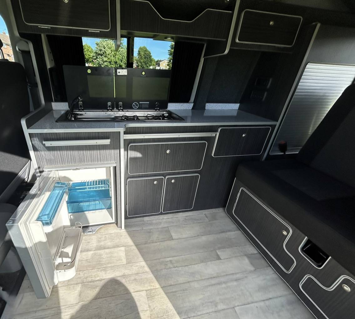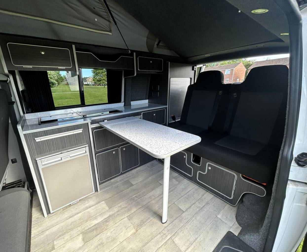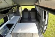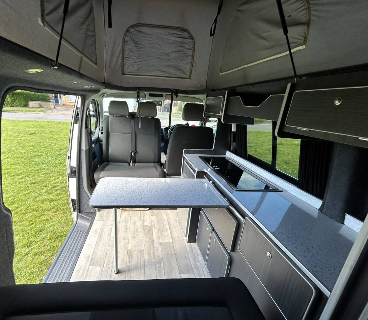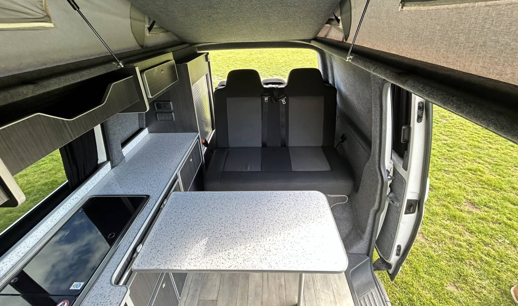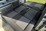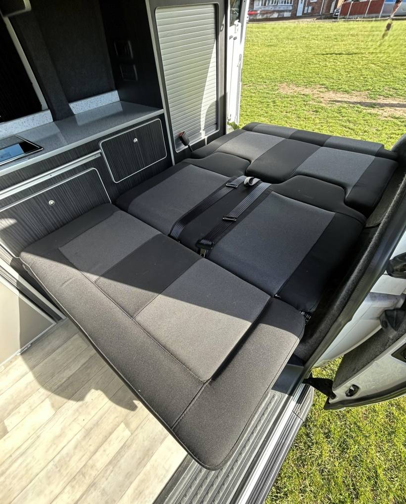 To the rear of the vehicle, you will find the Rock n Roll bed which has two travelling seats. Above you will find the Pop-Top with bed board and Duvalay memory foam mattress.