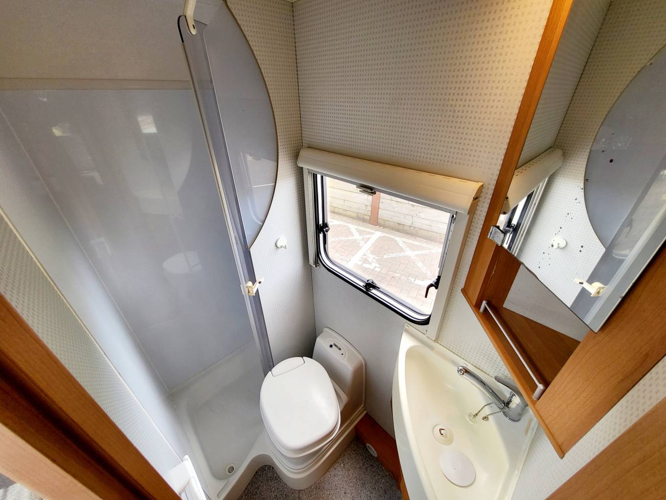 The kitchen is behind the Centre Dinette Area and across from the habitation door which allows extra ventilation when cooking a hearty meal for any occasion and comes with 3 Gas Hobs, Hot and Cold Mixer Tap, and a Large Fridge with great freezer space.