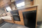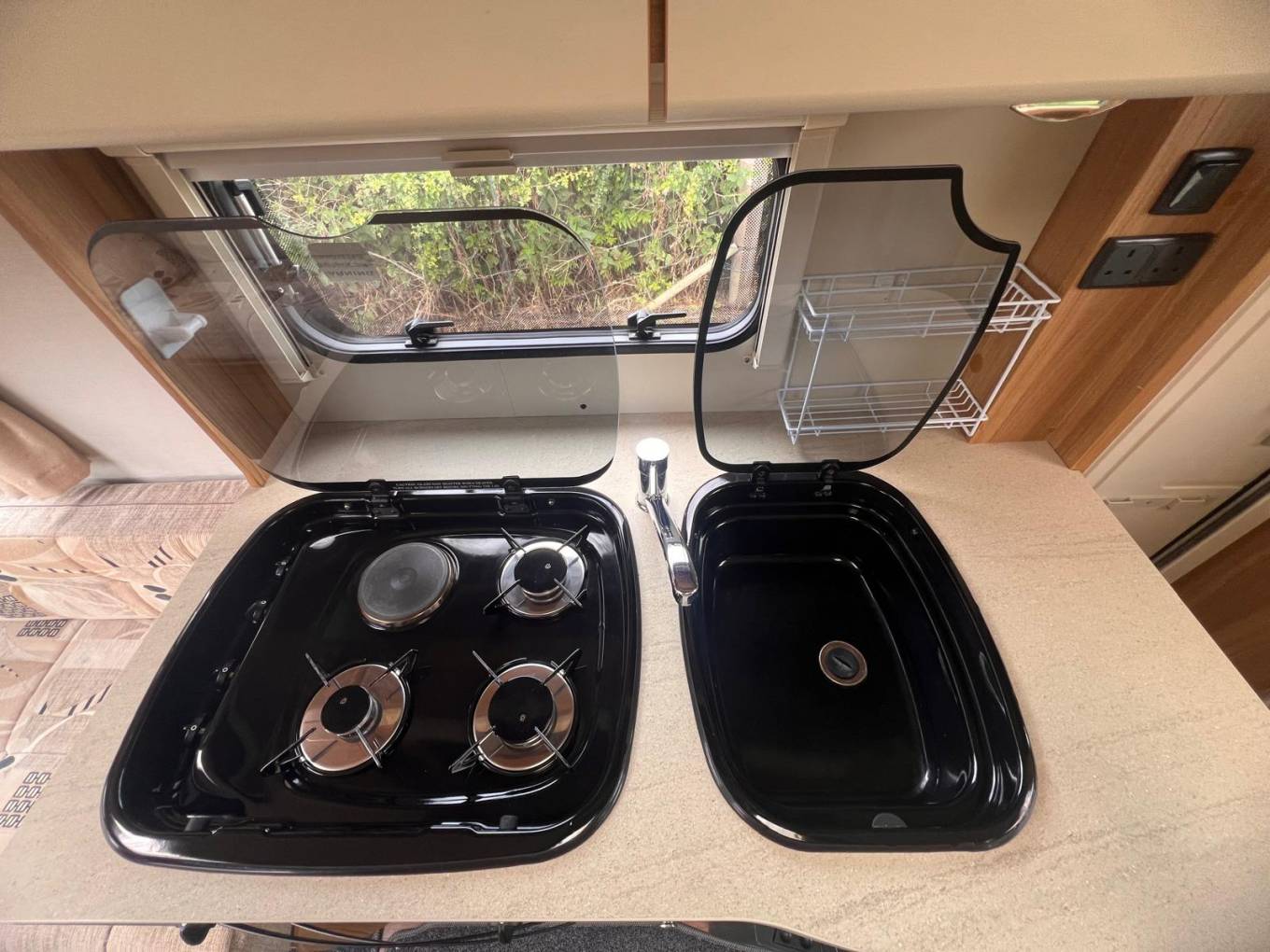 Opposite the kitchen sits a practical and compact washroom, complete with a cassette toilet, basin, and shower facilities.