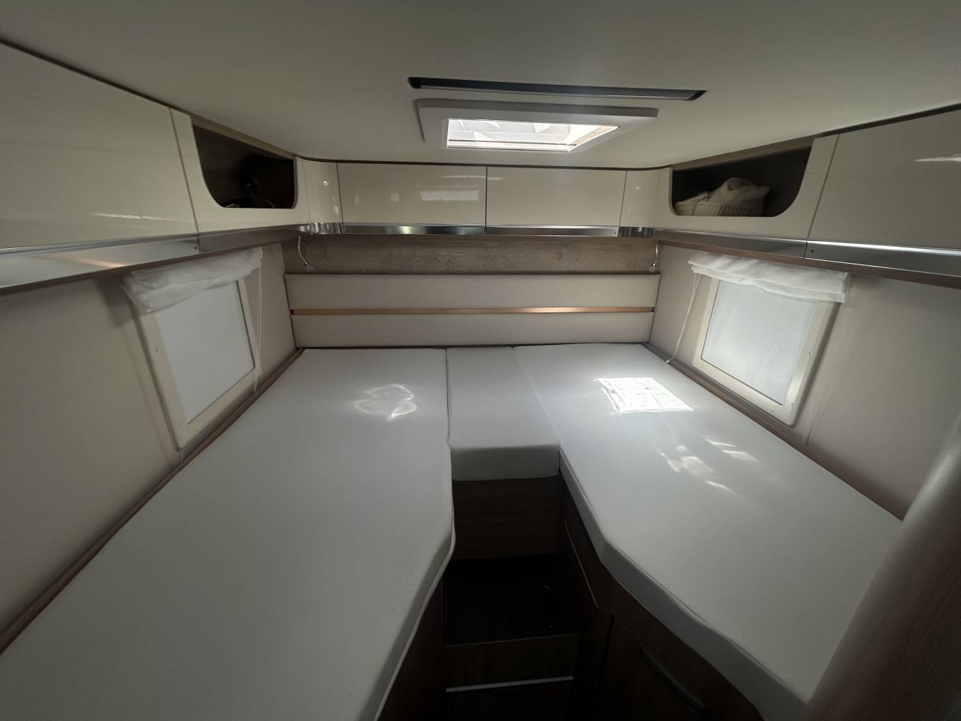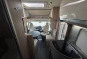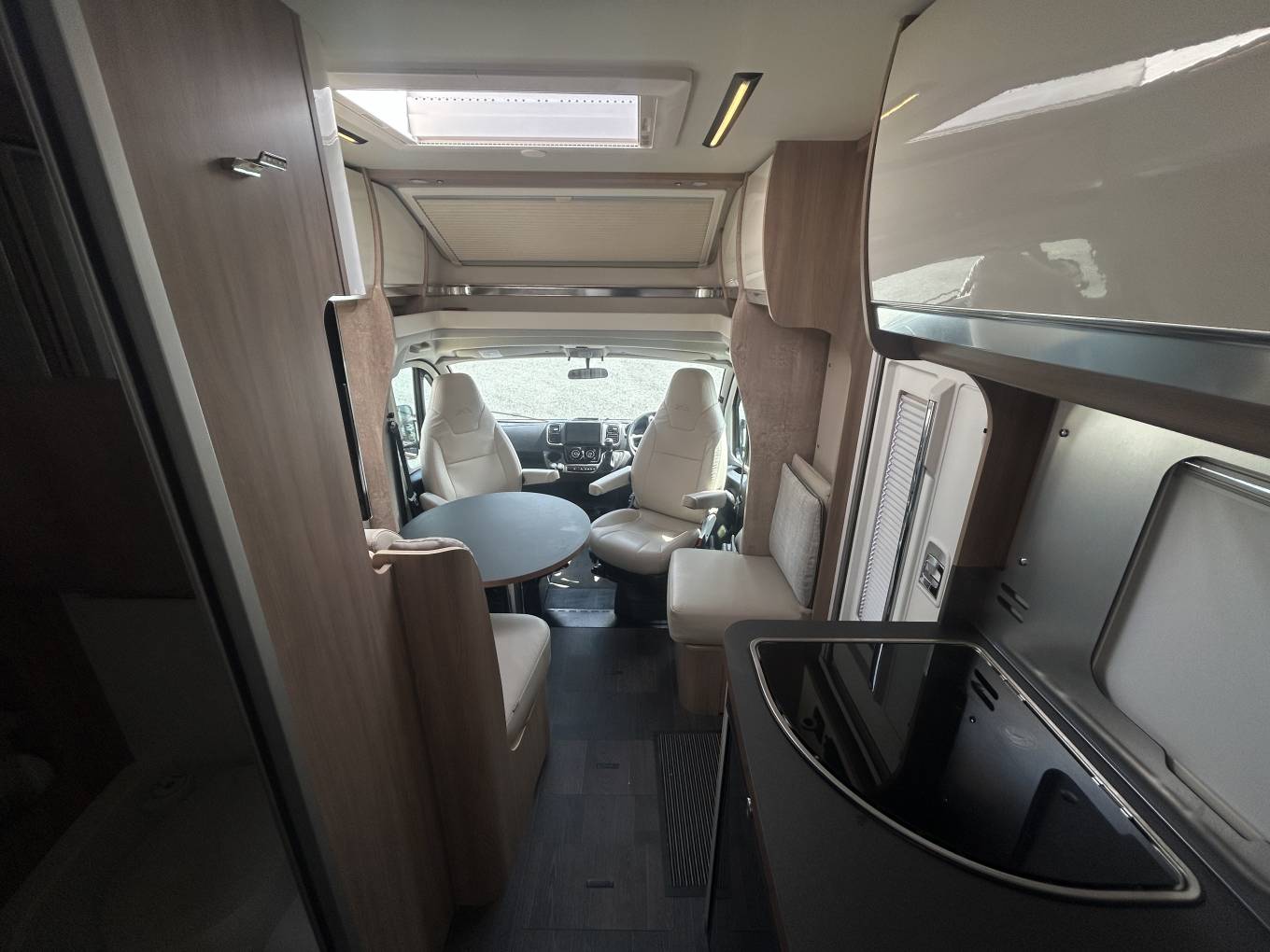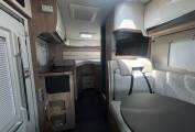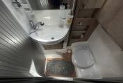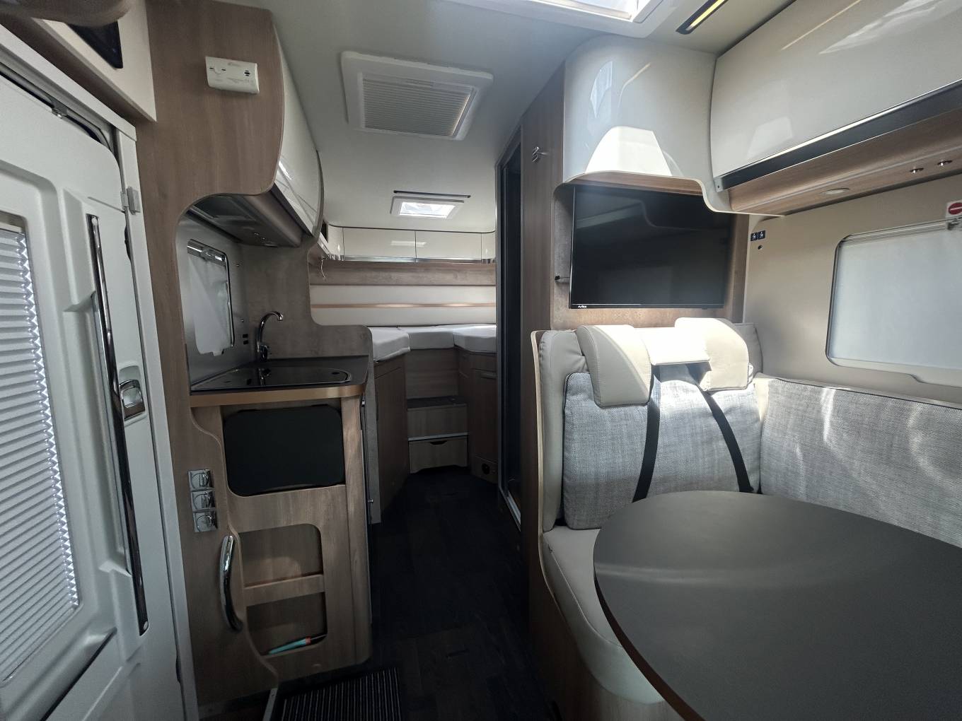 Internally the motorhome has an excellent layout and makes the most of the space available. At the front you have a lovely living area comprising of the two captains chairs, L-shaped sofa and and a further single side facing sofa. There is also a good sized multi-directional table - ideal for meals or even browsing a tablet or laptop. The motorhome comes with a large 32" Avtex TV. Moving back you come to the continental style kitchen - this features a gas hob, sink and good sized fridge with ice compartment. The motorhome does not come with an oven but they are rarely used and most people prefer air fryers whilst on mains hook up or cooking outside on a bbq - using the external bbq point. The motorhome has lots of clever storage space and even has a pull out cupboard with storage draws under one of the beds.