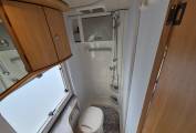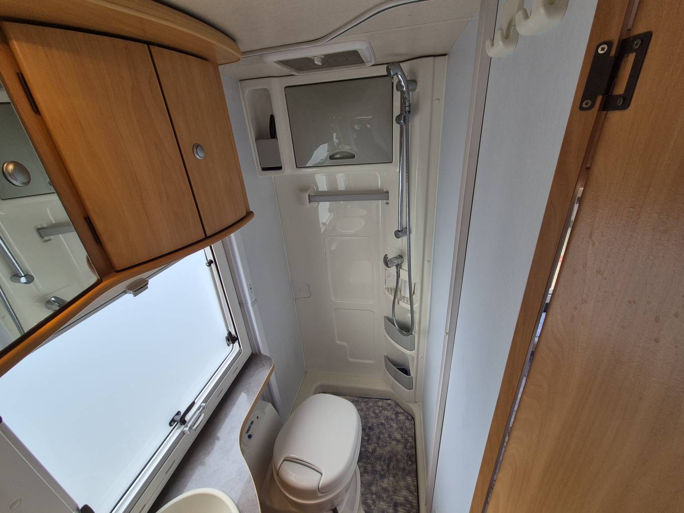 - The washroom has a separate shower cubicle with folding curtain, riser rail with shower handset and dedicated chrome tap. A built-in washbasin with chrome mixer tap, Thetford cassette swivelling toilet, upper and lower storage cabinets.