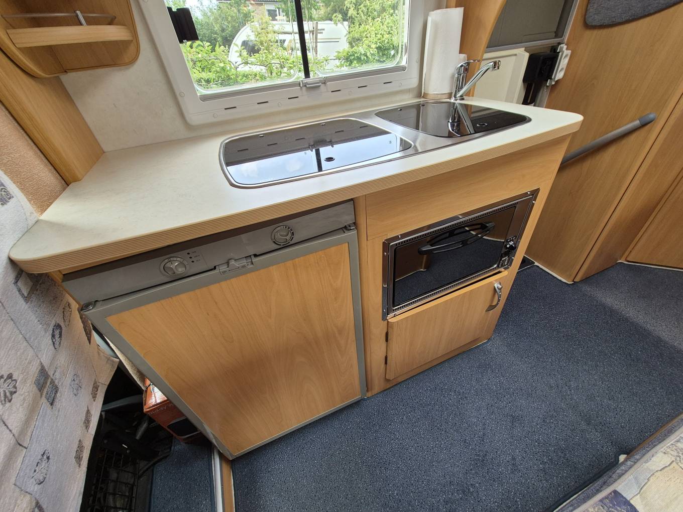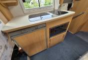 On entering the van the kitchen/galley area is on your right, a large stainless steel sink , chrome mixer tap and dark glass lid, a 3 gas burner hob with dark glass lid, plus a combination oven & grill fitted beneath. A Dometic 3-way powered fridge with freezer box, plus upper lockers to store away your holiday provisions.