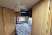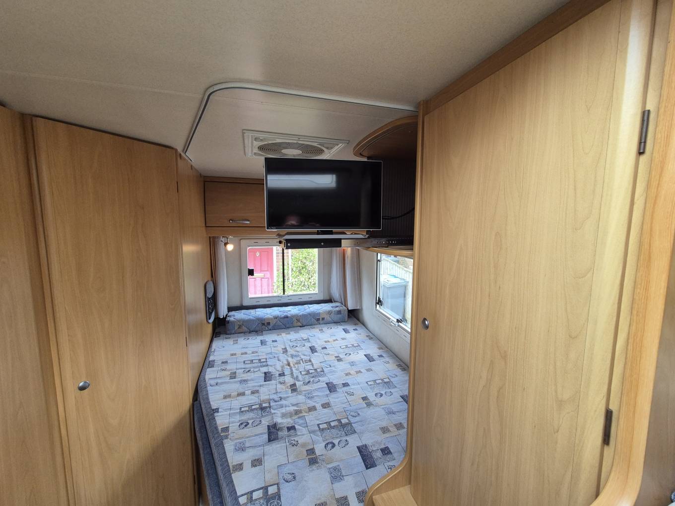 - The rear bedroom has a French style double bed that’s easy to access, with a huge storage space underneath and upper storage lockers and a TV cabinet, ( the TV can swivel to be seen from either the lounge or bedroom areas) rear & side window plus a roof vent and a privacy curtain.
