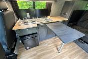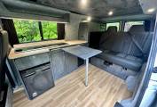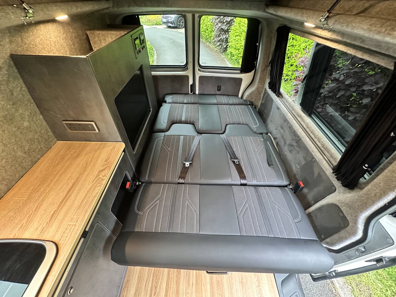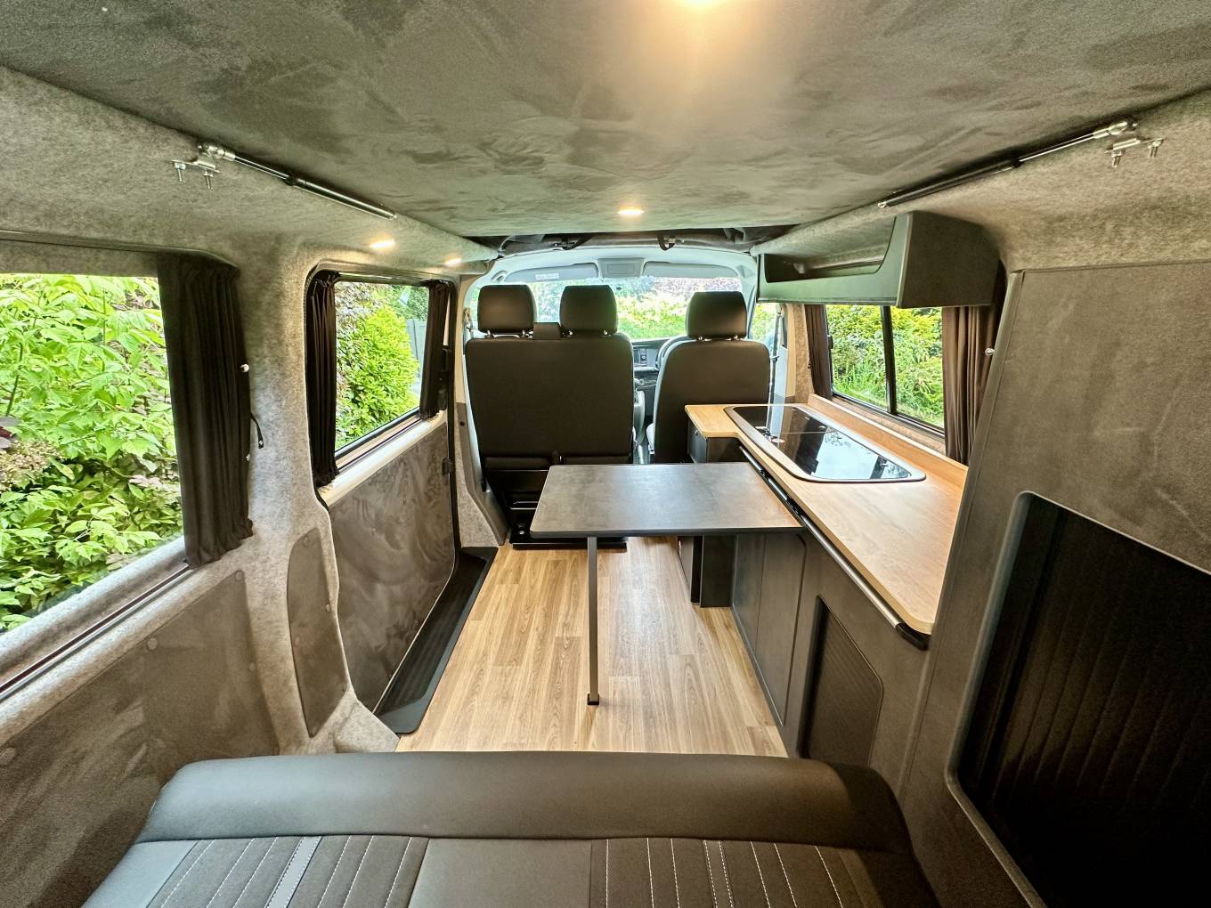 Entering through the side door we are greeted by the attractive interior with stylish grey units complimented by oak effect worktops and flooring. There is an abundance of storage along with a Dometic combination sink/hob and CamperCool Fridge. The rock and roll bed features two additional 3 point seatbelts and also creates a comfortable double bed. For Dining the front double passenger seat can swivel to allow four to sit around the large removable table. You will find the second sleeping area in the pop top which has a panoramic canvas giving plenty of natural light. When this is not being used it pushes up to maximise head room.