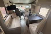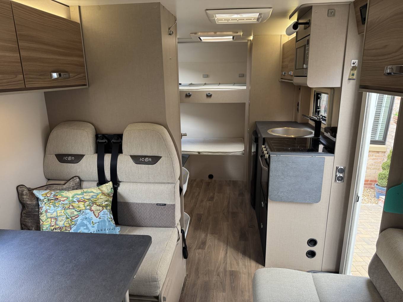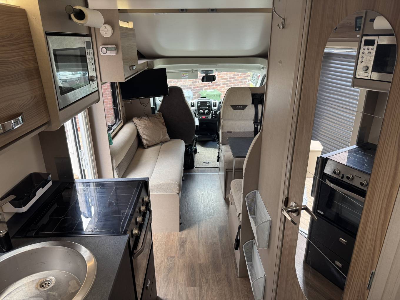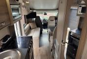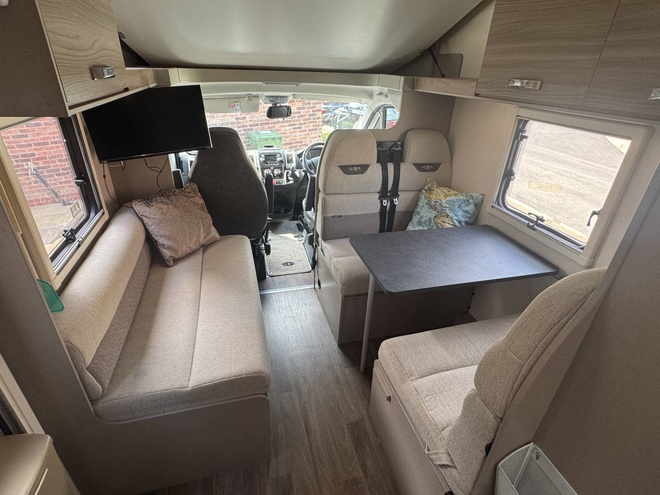 Opposite the kitchen is incredibly spacious central dinette and is flooded with light making it a fabulous spot to relax and unwind in. There is a forward facing 2 seater sofa with 2 seat belts and a rear facing 2 seater sofa fitted with a further 2 seatbelts along with a large dining table in between.