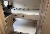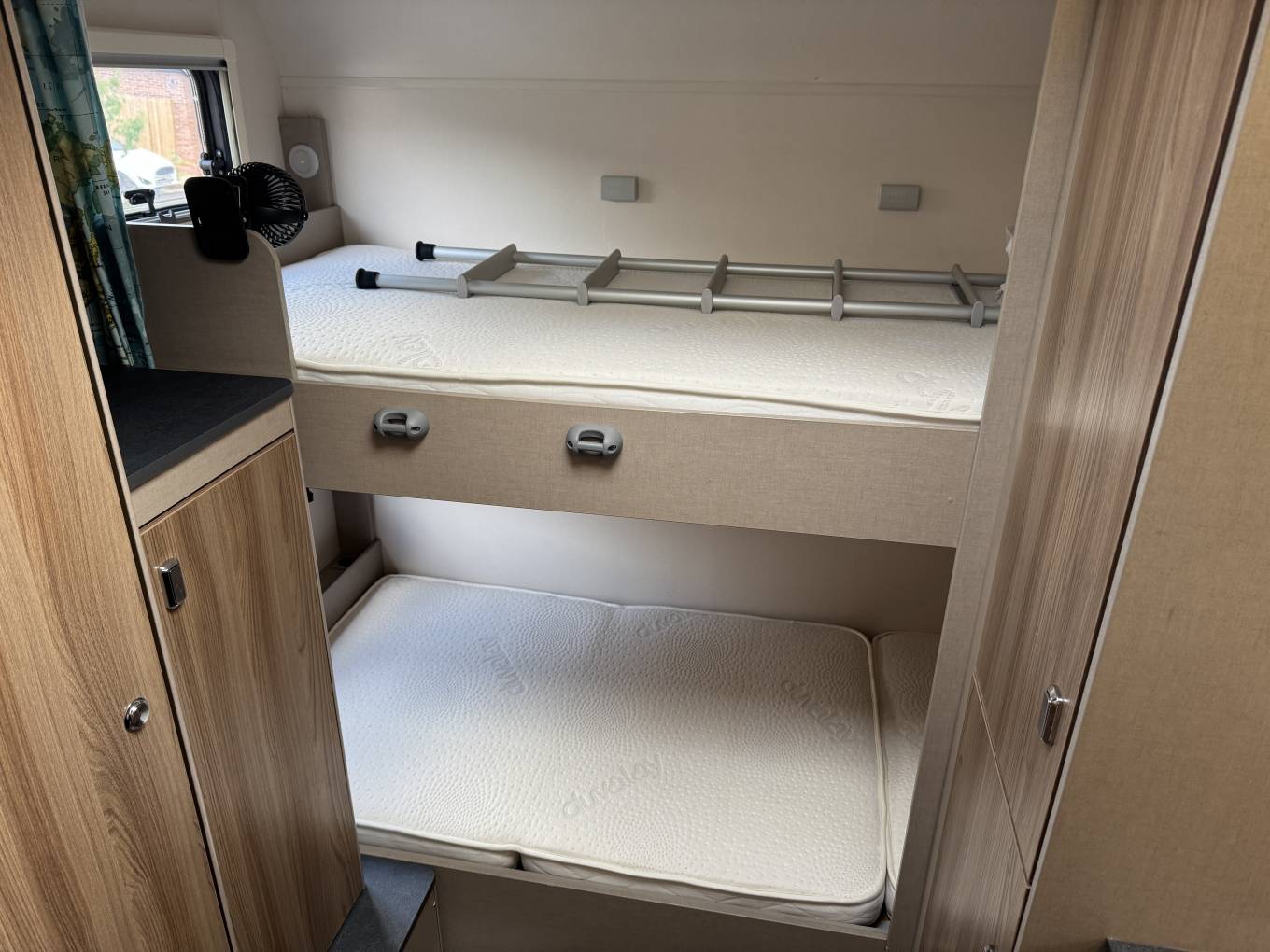 The sleeping arrangements consist of 2 large double beds and 2 bunk beds, the first one is the rear bunk beds where the bottom bunk can be stored in the upright position to enlarge the garage, the second bed can be converted from the centre dinette, and the third is the over cab bed that will easily sleep 2 adults.