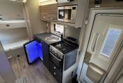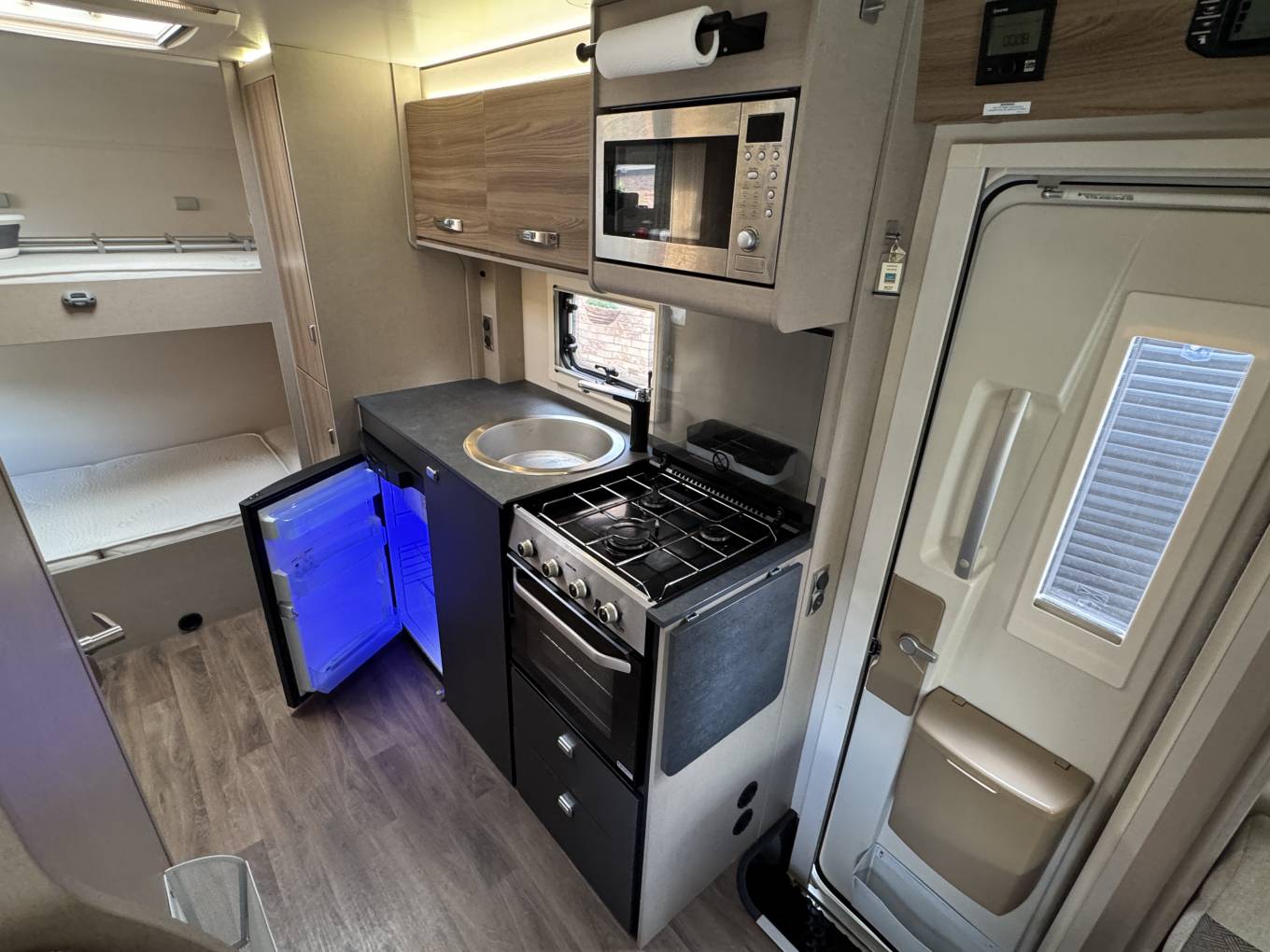Carrying on through, you come to the kitchen which has everything you need to rustle up a lovely meal. There is a 3 gas ring burner hob, a Thetford Triplex oven with grill, a large Dometic 3 way fridge freezer, a sink with mixer tap, a microwave and lots of storage space for utensils and ingredients plus a good work top area.