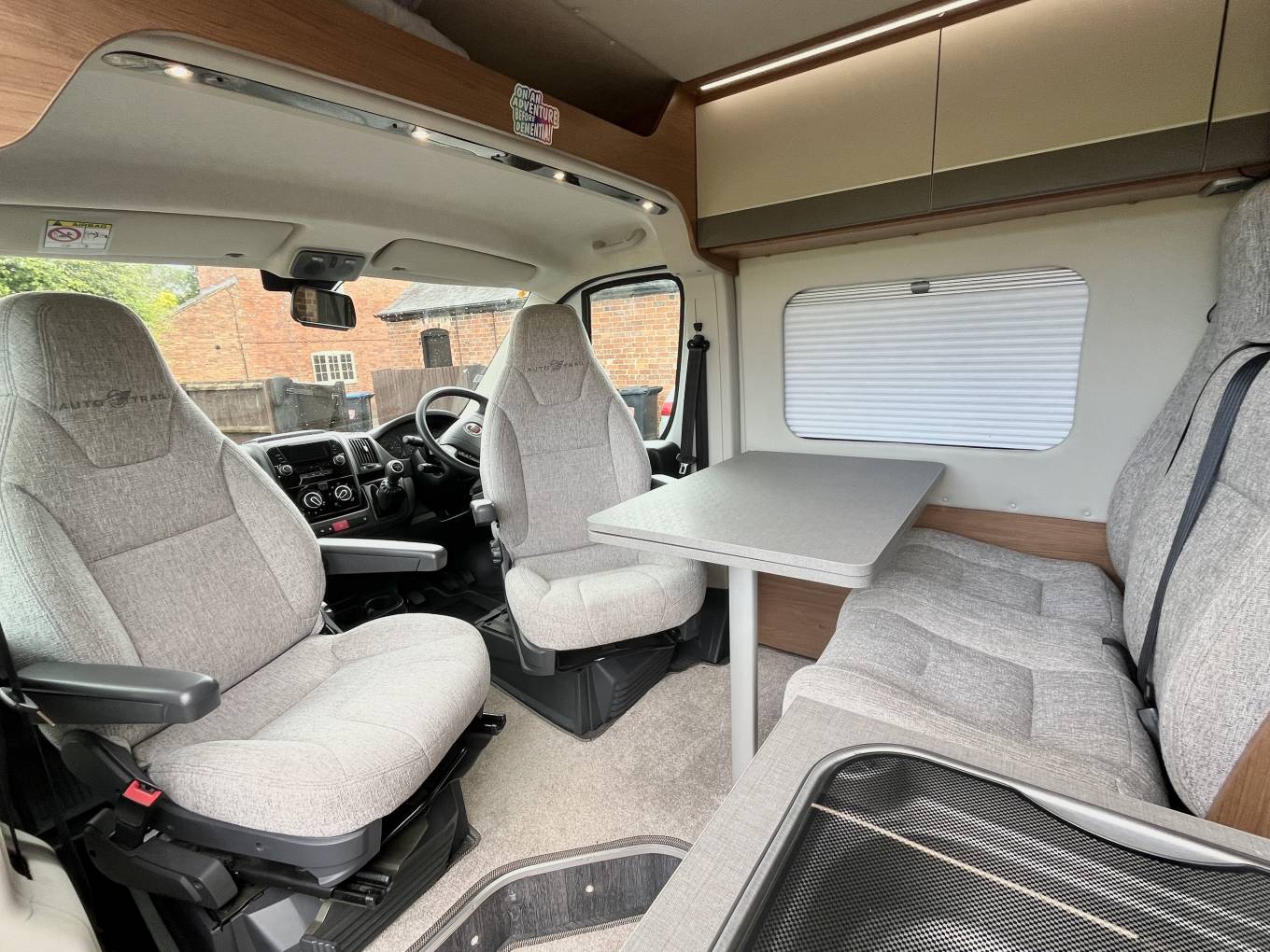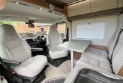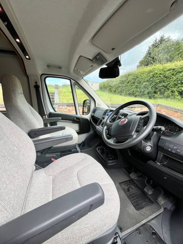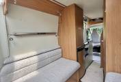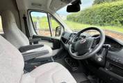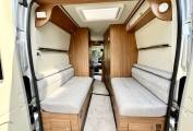 Once inside the van you see the dining / socialising area, the front twin captains seats swivel to give seating comfortably for 4 people, the extendable dining table can be removed if required and the two rear seats are also complete with three point seatbelts to allow safe travel for passengers if needed.
